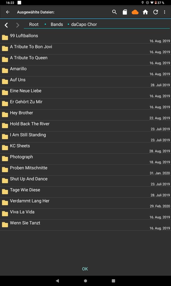 "Leadsheeter", selber gemacht, siehe hier: #240Bei MobileSheets komme ich über das + zu einer Auswahl, da wird U.A. alles an Cloud Diensten angezeigt, aber man kann auch auf den internen Speicher zugreifen.