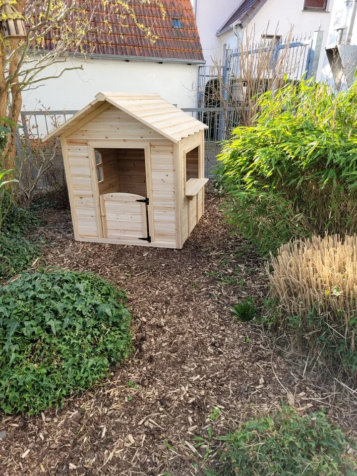 Habe die Tage ein kleines Garten-Holzhaus fĂŒr die Kids gekauft und dort aufgebaut, wo wir die groĂe MulchflĂ€che haben.