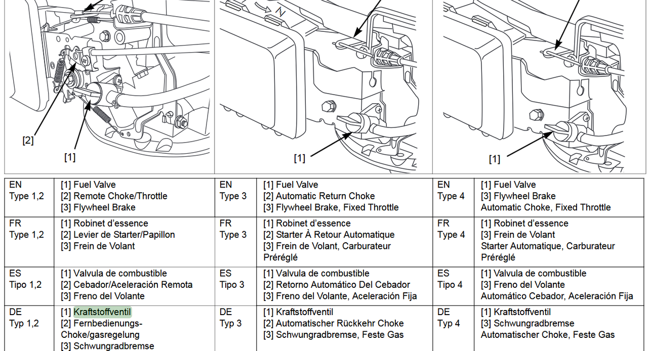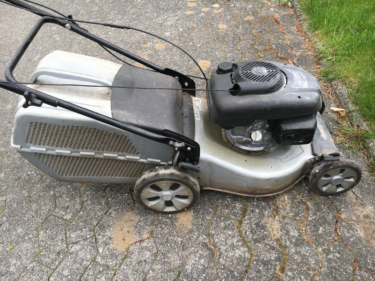 Er müsste noch noch heil sein, stand aber lange herum. Ich habe mir gerade den Arm ausgerissen bei etlichen vergeblichen Versuchen, ihn zu starten. Benzintank ist voll, Öl bekomme ich nicht geöffnet, Zündkerze scheint sauber zu sein und sitzt fest. Habe erst mal unter den Boden gesehen, der Raum mit dem Messer sieht ok aus. Es gibt zwei solche Spangen am Griff, die habe ich beide festgehalten, wenn ich zu starten versuche.