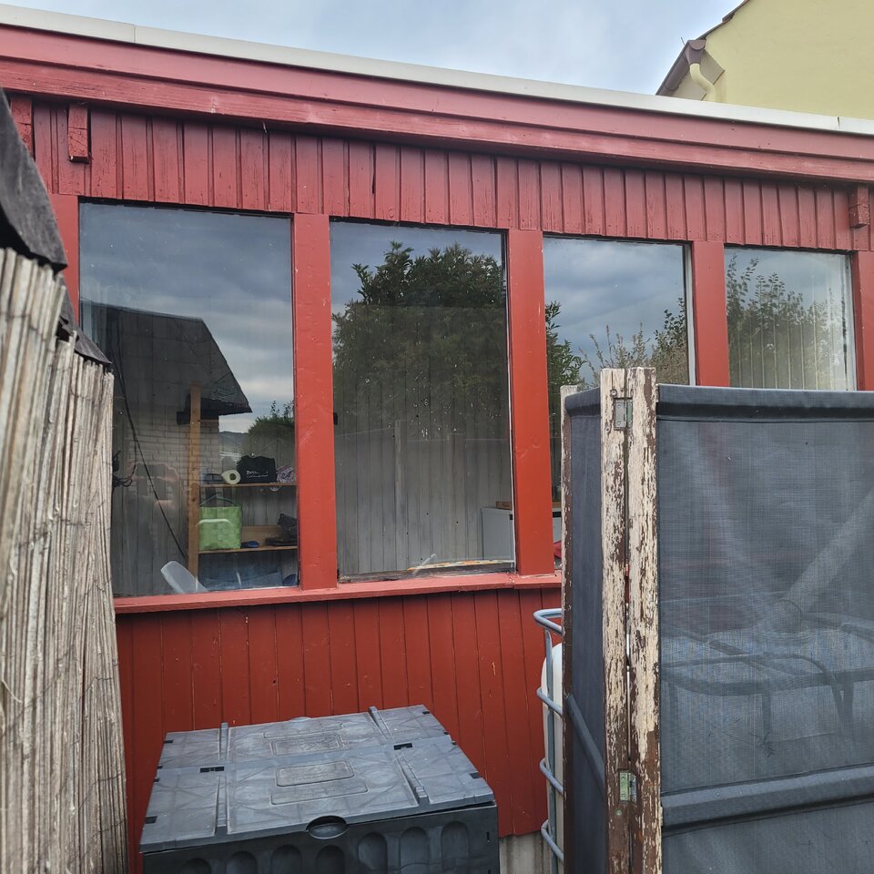 Der Sitzteil hat eine Fensterfront. Rechts hinter der hässlichen Trennwand steht ein Wasserspeicher mit Zapfhahn. Daneben der Komposter Nr.2...Nr.1 steht rechts vom Bild. Wie man auch rechts sehen kann, ist das Nachbarhaus nicht weit weg