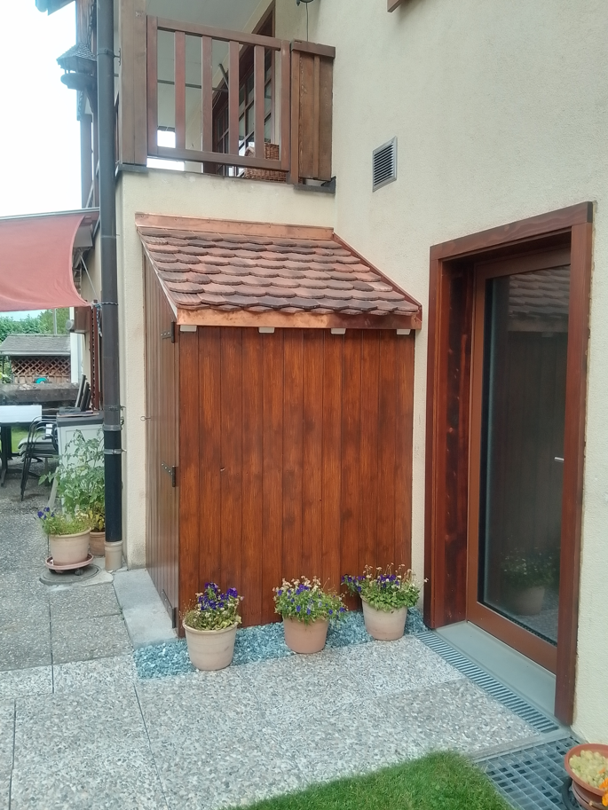 Ich habe eine Gartenhütte: 9x3,5m an der Grundstücksgrenze. Der Großteil davon ist nun saniert und zum Sitzen etc gedacht. Der kleinere, abgetrennte Teil ist Geräte und Fahradschuppen.