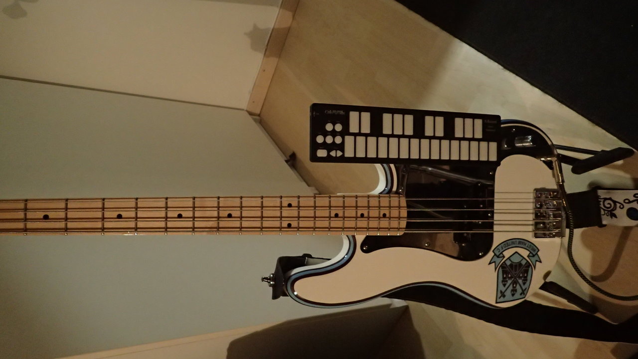 Ich verwende verschiedene Midicontroller um Synths und Software zu steuern. Im Moment bin ich dabei ein "Live" Setup zu erstellen, die Software und Effekte steuere ich mit dem Fuss, aber für Melodie- und Droneparts, habe ich zu wenig Füsse. Mein Gedanke ist nun, einen Controller am Bass zu befestigen, sozusagen eine Basskeytar. So wie auf dem Bild (Controller ist nur aufgelegt).