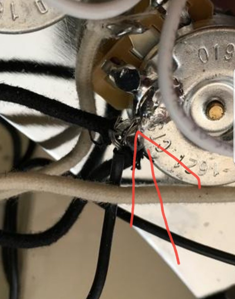 Da ist nicht nur die Erdung drauf, sondern auch die Masse (schwarzes Kabel der PUs) der Pickups.... auch Hals-PU, wenn ich das richtig erkenne.