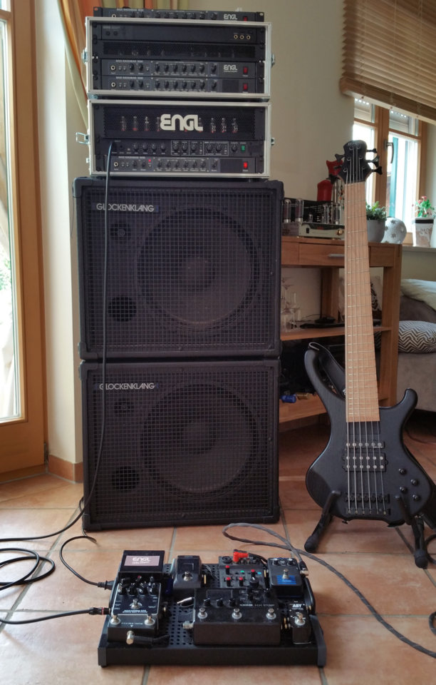 Das Thema mit zwei Amps und mehreren Boxen finde ich sehr spannend. Insbesondere in Kombination mit Stereo Effekten im Bereich Modulation. Meine aktuelle Konfiguration ist Jazz Bass in das Effektboard mit u.a. Chorus, Phaser und Delay in Stereo in Bodentreter Ausführung. Verstärkt wird Kanal eins über das Soul Top in Kombination mit Space deluxe 8 Ohm und Space Art 8 Ohm. Kanal 2 läuft über einen Blue Sky mit einer Takefive in 8 Ohm. Somit passen Ausgangsleistung der Tops und Schalldruck aus den Boxen recht gut zusammen. Beide Tops werden ohne Klangregelung betrieben. Irgendwie bin ich nach viel Schrauberei an den Reglern immer wieder bei der deaktivierten Klangregelung gelandet. Da ich nur passive Bässe spiele sitzt noch ein Boss Pedal EQ auf dem Board, mit dem eine leichte Badewanne eingestellt ist. Das klingt für meine Ohren seltsamer Weise besser, als mit der Klangregelung der Amps geregelt. In Mono ohne Modulation gespielt macht sich bemerkbar, dass die Kombi 12er und 10er GK Boxen nicht ganz optimal ist. Das wurde hier im Forum auch schon an anderer Stelle beschrieben. Die beiden Space zusammen betrieben kommen in meinen Ohren etwas tiefer runter in den Frequenzkeller. Wenn ich die Takefive dazu mische und den Lautstärkenpegel angleiche, dann geht minimal Tiefgang verloren. Durch die dann reichlich vorhandene Membranfläche entsteht gleichwohl ein wirklich geiler Druck, schon bei geringen Lautstärken. Noch etwas sauber klingt es allerding, wenn beide Kanäle mit jeweils einer Space betrieben werden. Dann fehlt mir wieder etwas der Punch der 4x10. Mir macht das Soundgetüftel einfach nur Spass. Und mit dezenter Modulation gehen einem dann sprichwörtlich die Ohren auf. Vor dem Wechsel auf Glockenklang hatte ich diverse Amp Boxen Kombination von Markbass. Die Boxen, noch mehr als die Amps von Glockenklang, sind, verglichen mit Markbass, zumindest für meine Ohren, die passendere und wohlklingendere Wahl. Im direkten Vergleich Soul I vs. Blue Sky gefällt mir persönlich der etwas direktere und nochmals klarere Klang des BS geringfügig besser. Die Ausgangsleistung des Soul an 4 Ohm reicht für meine Anwendungen locker. Insgesamt sind es für mich allerdings nur klangliche Nuancen, die die beiden technisch sehr unterschiedlichen Tops trennen.