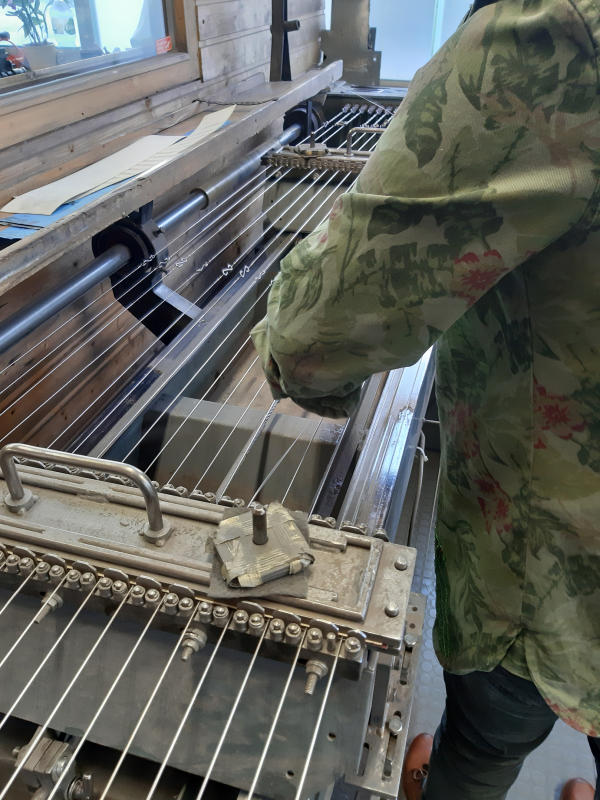 Nach dem Wickeln werden die Saiten poliert. Die Maschine stammt noch aus den 1960er Jahren und wird per Hand bedient.