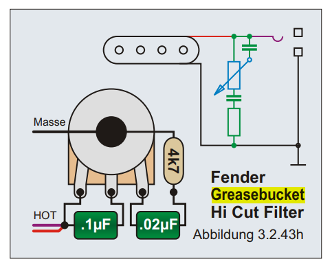 Der zweite Teil der Magie ist IMHO der 4,7kOhm Widerstand. Der simuliert schlicht und ergreifend ein nicht ganz geschlossenes Poti. Nicht mehr und nicht weniger. Wenn man ein Tone-Poti ganz zu hat, liegt der C einfach parallel zum Pickup, bildet mit dem einen Schwingkreis und erzeugt an der Cut-Off-Frequenz nochmal einen Resonanz-Buckel (d.h. zB in obiger klassischer Preci Konfiguration werden die 300hz nochmal eine Spur lauter, bevor es nach oben hin abfällt).