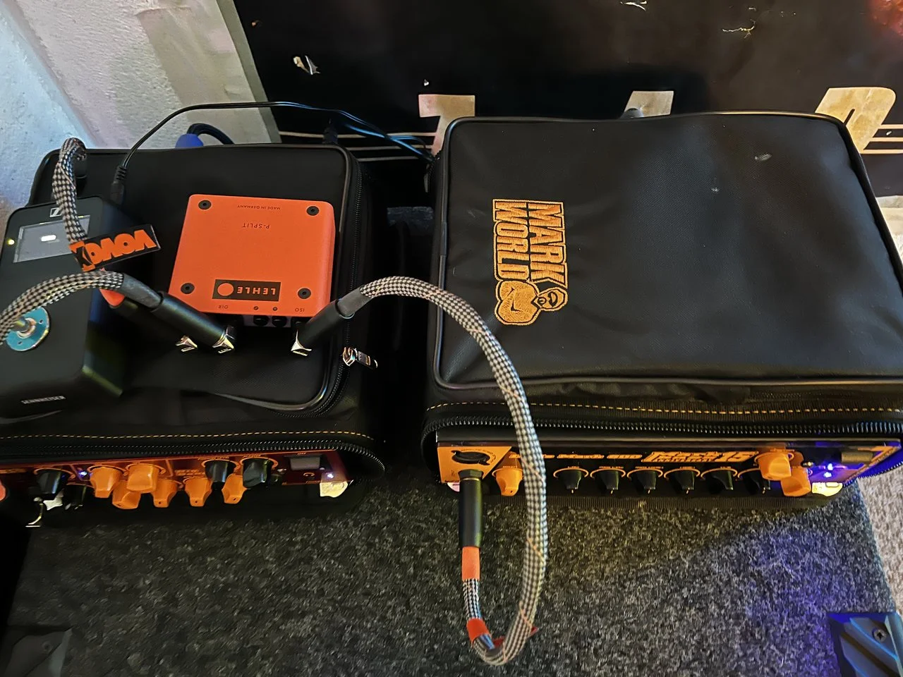 Als Hauptverstärker werkelt eine Mesa 800+ und über die Send Buchse ist der BAM200 von TC electronic angeschlossen, der dann das Pleasure Board antreibt.