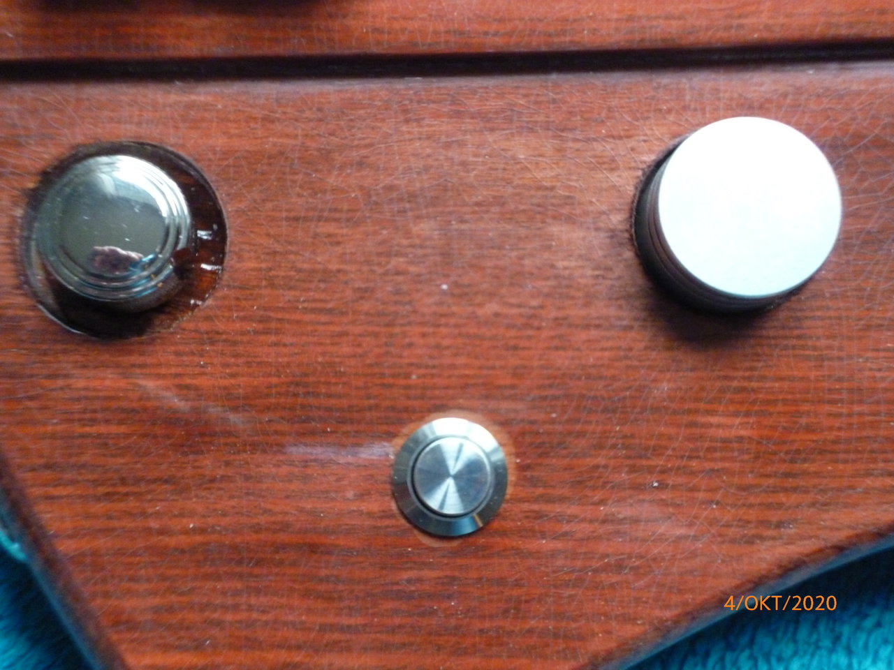 Die Poti-Knöpfe. Thomas hatte mir die Potis versenkt eingebaut mit großer Fräsung für seine Knöpfe. Er hatte nur welche in alu, das passt aber farblich nicht so gut zum vernickelten Rest. Dann habe ich da vernickelte, aber die sind halt kleiner, das sieht irgendwie nicht so stimmig aus: