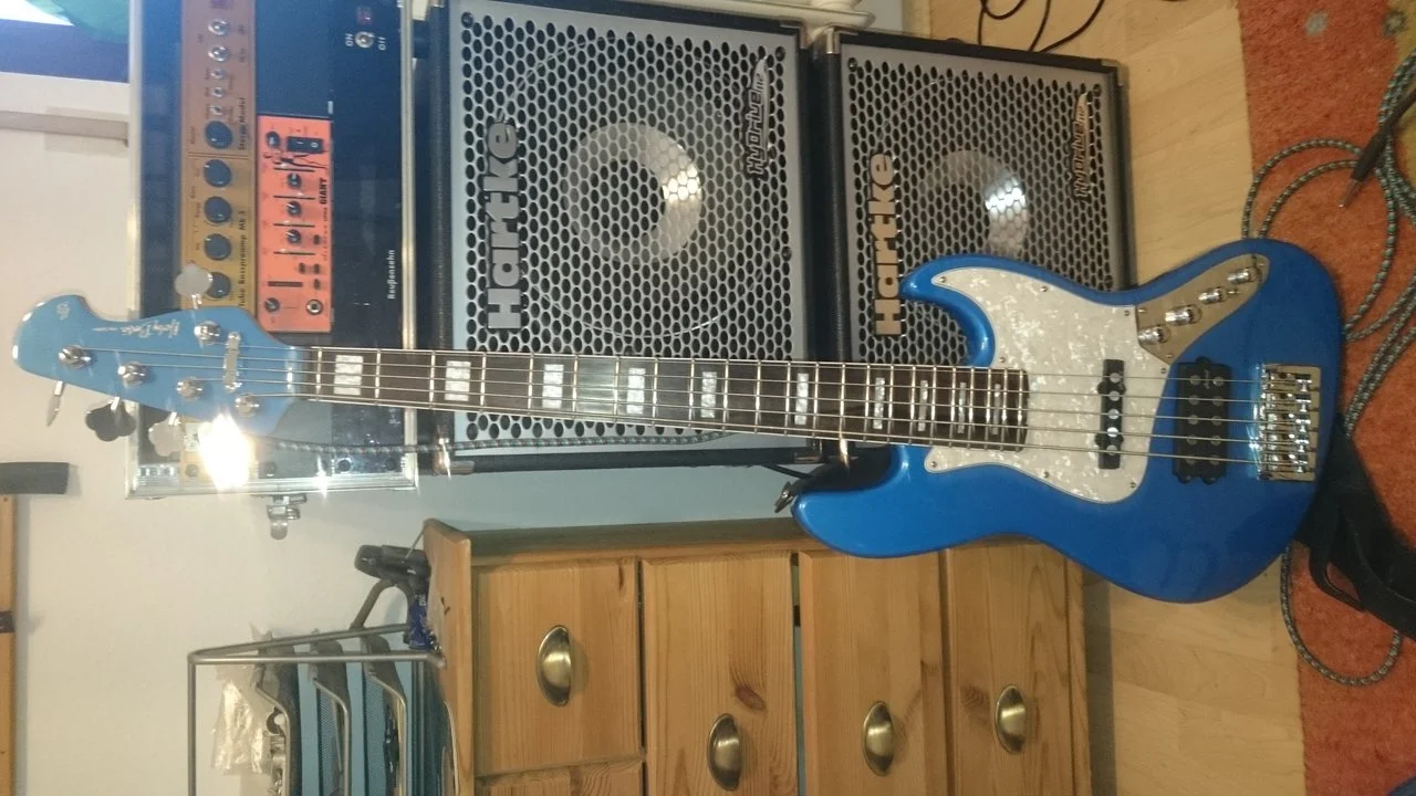 Und da ich seit Längerem einen Fünfsaiter mit MM-Pickup, aber ohne das fürchterlich enge Stringspacing vom Sting Ray, dachte ich, den probier ich einfach mal aus. Wenn er von der Konstruktion ok ist, ist ja noch bissl Kohle für andere Pickups,EQ o.ä. drin oder er geht einfach für den gleichen Preis wieder. Zum oben genannten Gewicht: Die Erle des blauen scheint etwas leichter zu sein, der Bass wiegt 4,4 Kilo, sagt meine Waage.