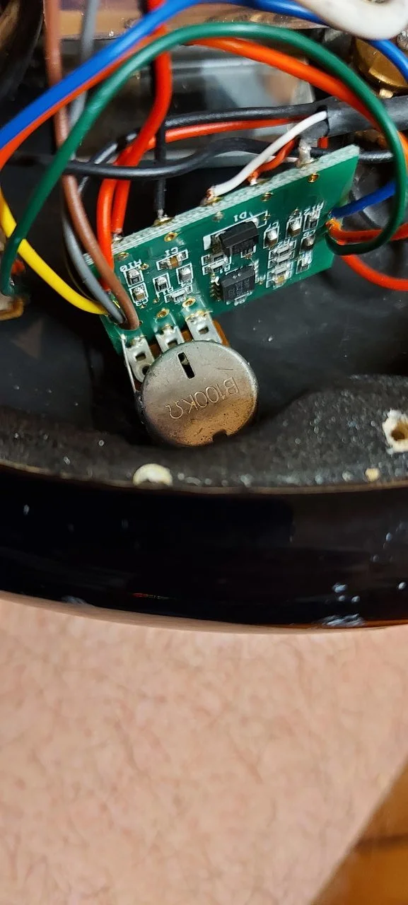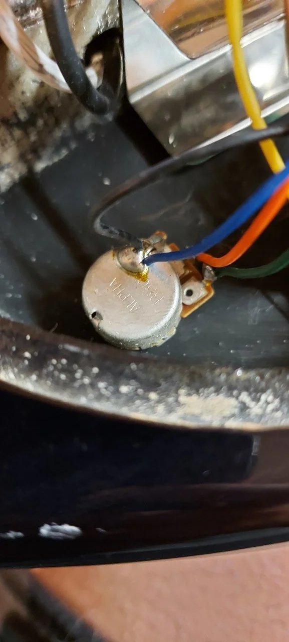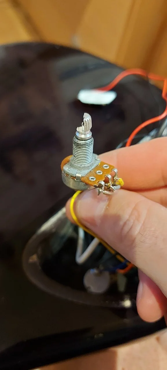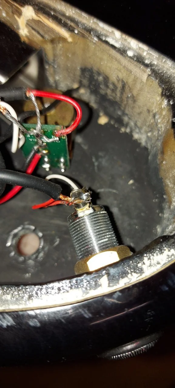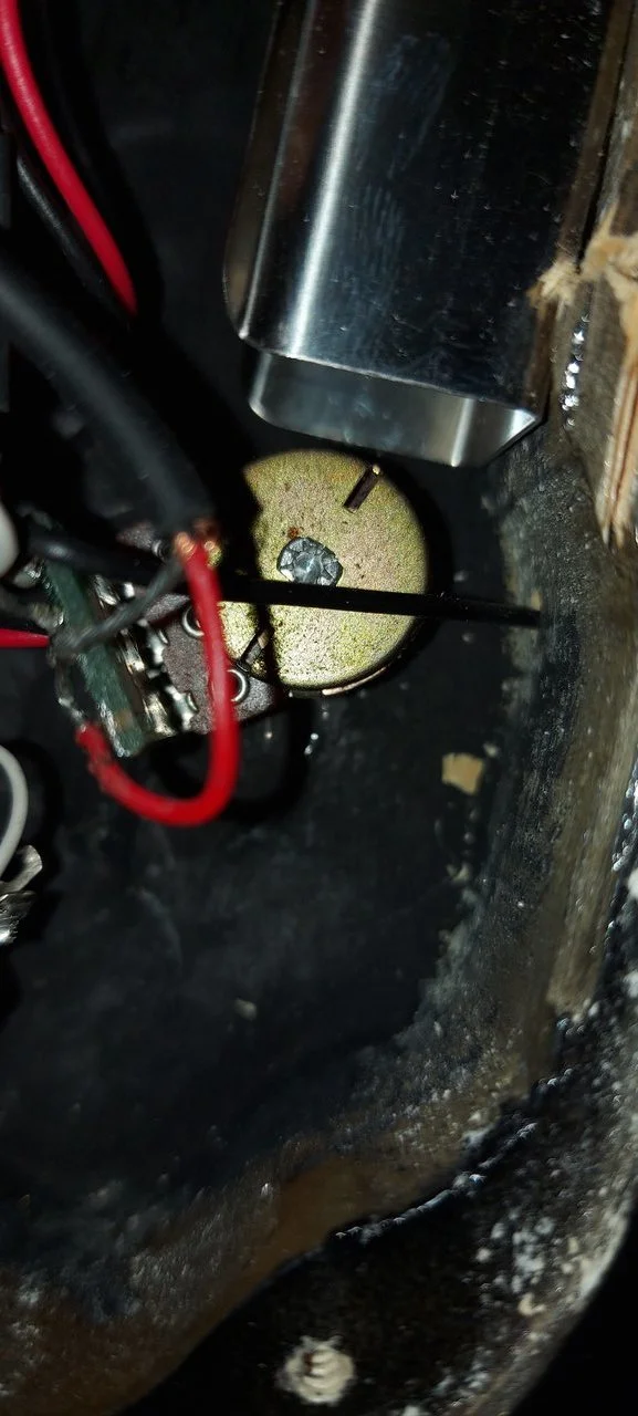 Leider hat der Poti unten rechts einen Treffer abbekommen, ist glaub ich der Volume-Steg-Pickup-Poti. Es rauscht, kracht, knistert...