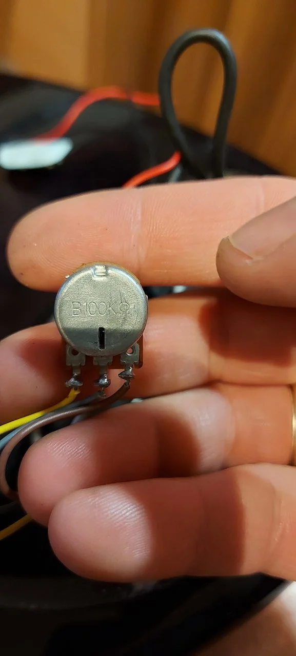 Auf dem Poti steht B100k Ohm, hat eine Mittelrastung und drei Lötösen...