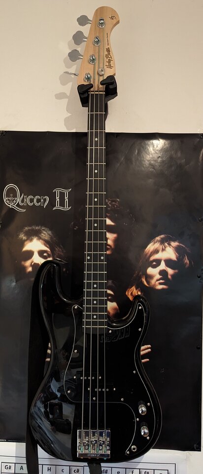 Schwarzes Pickguard, Fender HiMass Bridge, Fender Flatwound und Richter Precision Bass Elektronik.