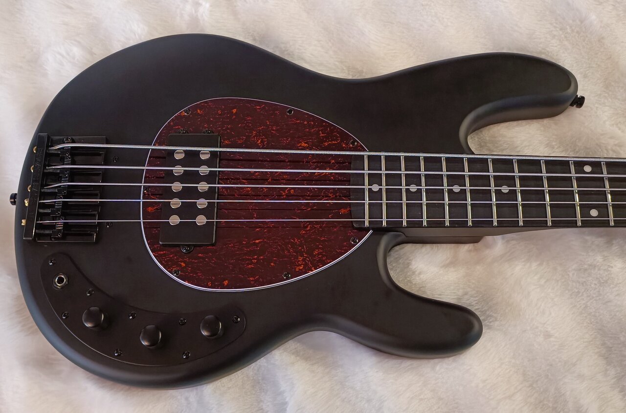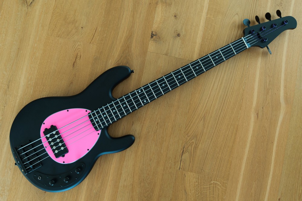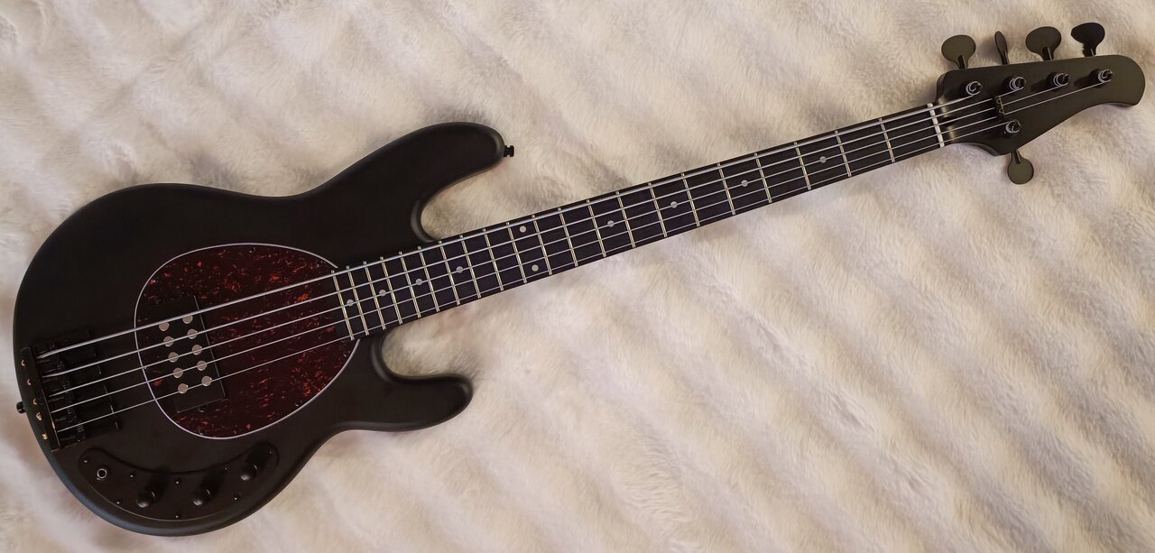 Konnte letzte Woche den Gasfinger nicht stillhalten und habe mir einen MB-5 Deluxe bestellt. Gewicht war OK, H-Saite auch korrekt, durfte bleiben. Wie üblich, habe ich meinem Aufrüstwahn freien Lauf gelassen und erstmal Maßnahmen gegen die Kopflastigkeit ergriffen. Seit heute klebt eine Badass Bridge auf dem Bass und die Tuner sind durch die superleichten Hipshot Lollipops ersetzt. Den Headstock habe ich bei der Gelegenheit gleich in eine schickere Form gefräst und nachlackiert. Dann noch die Bünde abgerichtet, Sattel nachgefeilt und frische Ernie Ball Cobalts drauf. Da die Tuner fast 200 Gramm zu den Standardteilen eingespart haben, eine kleine Schippe Holz fehlt und die Bridge auch deutlich schwerer ist, passt die Balance jetzt einwandfrei. Mit hauchdünn unter 4,2kg geht das Kampfgewicht für mich klar und der Pickup gefällt mir besser als erwartet. Schöner Knorz, werde ich erstmal drin lassen. Einziges kleines Thema bei der Konstruktion: die Bridge habe ich ohnehin schon einen guten Zentimeter weiter hinten montiert, aber die Saitenreiter musste ich sehr weit anziehen. Dadurch stand die Schraube der A-Saite so schräg nach oben, dass ein leichter Sitar-Effekt entstand. Werde morgen dementsprechend die Schrauben kürzen, um diese Problemzone abzustellen. Das Pickguard geht für meine Augen gar nicht, aber zwei Rohlinge in etwas frischeren Farben sind bereits auf dem Postweg.