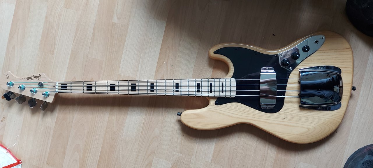 Fender Modern Player Hals gekriegt, aber der ist eigentlich schon wieder verplant. Eine neue Brücke musste auch drauf, wegen der Schönheit und weil man die Saiten einfach einhängen kann oder auch durchziehen. 15€ inChina, meine momentane Lieblingsbrücke