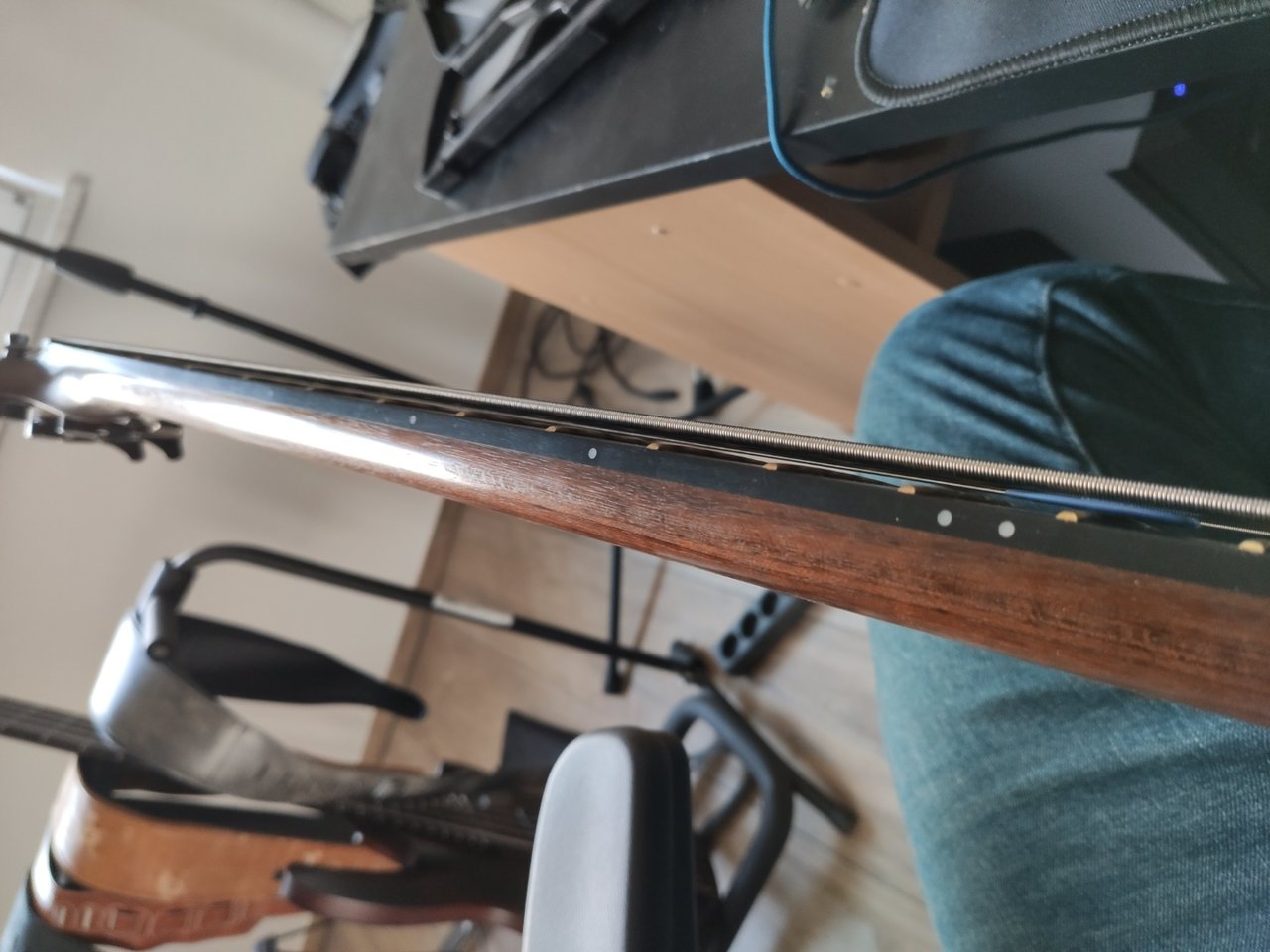 Soundschnipsel ist auch im Anhang, dann hörst, dass der Bass auf GCGCF ist. Einfach kurz direkt ins Audiointerface Fingerpicking, dann das 1,5mm Pick und n bisschen ... Mudvayne-Tapping. Funktioniert alles. Trotz dickem Warwick-Hals hat das Ding ne super Bespielbarkeit und der etwas loose Saitenfeel läd richtig zum daddeln ein. Wäre aber nicht meine erste Wahl, wenn Picking/Pick zum Einsatz kommt. Wie gesagt, mein Stingray, der dann gern mal gedroschen wird, ist definitiv höher eingestellt.