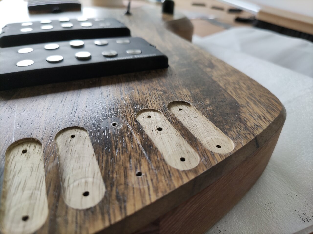 Der sieht echt klasse ausHöhenmäßig eine leicht komprimierte Toone-Grundform. Nicht schlecht, auch wenn ich's jetzt gar nicht so mit Paddeln habe. Habe meinen 5-saitigen Headless ähnlich aufgebaut. Für die Elektronik wird's da aber immer sehr knapp, deshalb habe ich unten noch einen Knubbel dran. Ist auch besser für die Oberschenkelauflage.