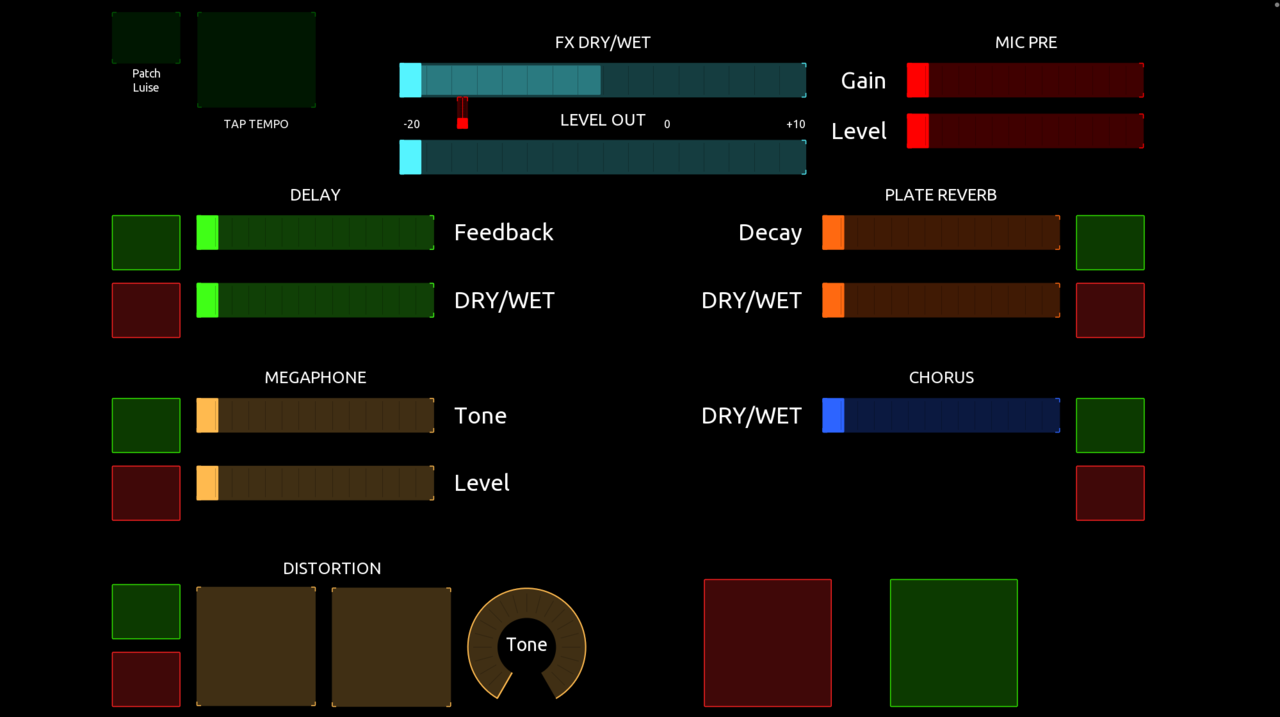 Anderes Thema: Ich hab am Wochenende meinen HX Stomp als Effektgerät für Vocals benutzt. War nur ein Kneipengig und ich sollte den Sound machen, aber hab dann die Vocals einmal durchgeschleift und als Stereo Return in den Mixer geschickt. Da der Mixer per Tablet kontrollierbar ist und ich keine Kabel haben wollte, habe ich mir einen Bluetooth MIDI Adapter geholt und mit TouchOSC eine Bedienoberfläche für die Effekte gebaut: