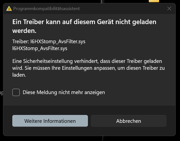 Ich habe ein Problem mit dem HX stomp seit mein Rechner auf Windows 11 läuft. Ein Treiber wird nicht erkannt und ich werde gebeten meine Sicherheitseinstellungen zu ändern.
