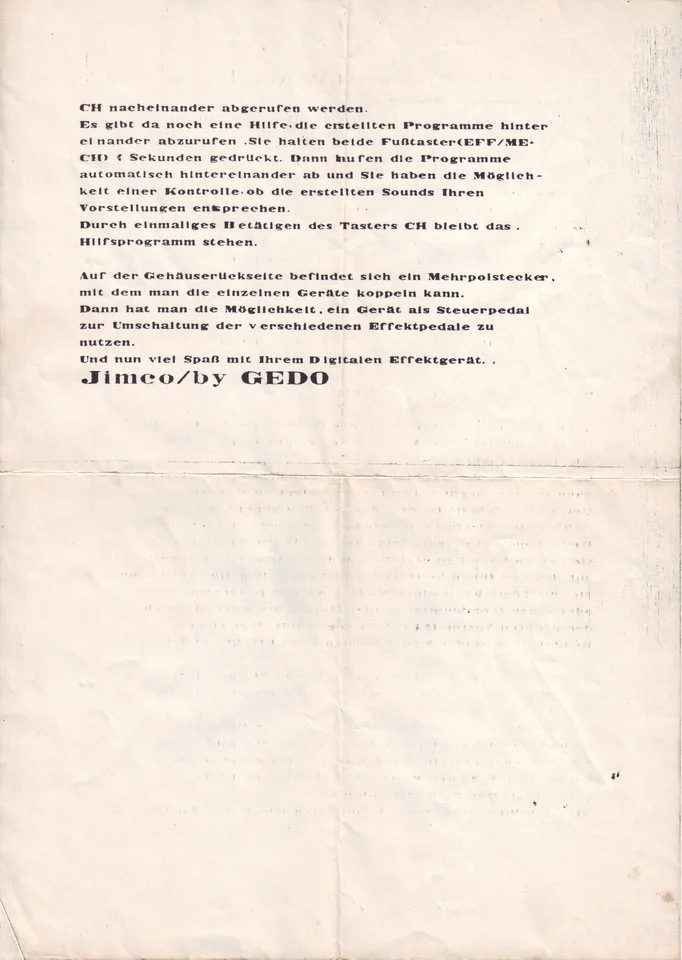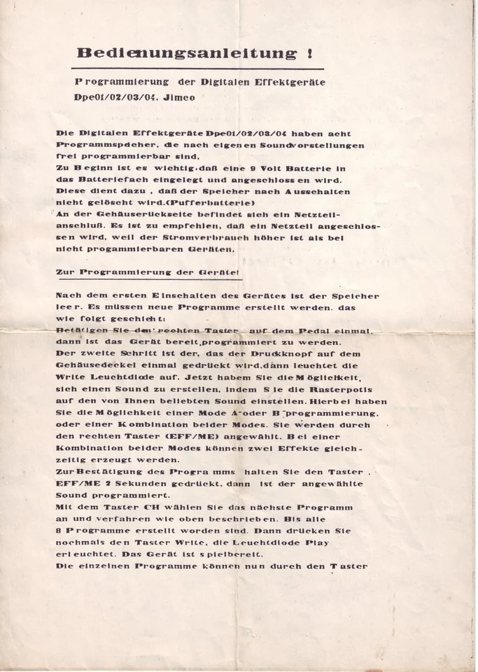 Von der verwendeten Technik würde ich auf 80iger Jahre tippen. "Jimco" war nur eine Handelsmarke. Alternativ wurden diese Pedal auch unter dem Namen "Juno" verkauft. Es gab wohl noch drei weitere Typen (DPE..02 und 03) aber mehr weiss das Internet leider nicht. Hergestellt wurde das Pedal von Kyowa Shokai, die sich mit ihrem Firmenlogo auch auf der Innenseite des Bodens verewigt haben.