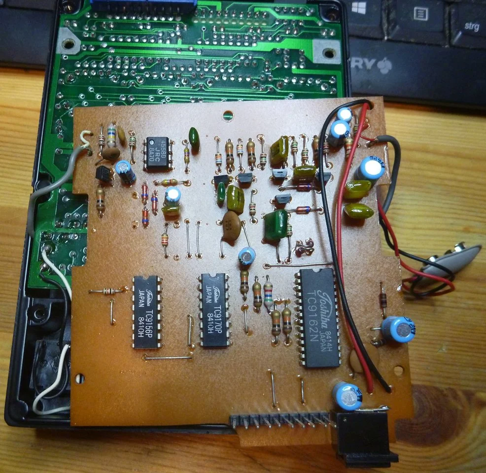 Ich hab das Pedal mal geöffnet und die Komponenten näher betrachtet: Auch wenn es nach einem digitalen Pedal ausschaut, ist der Signalweg komplett analog. Der digitale Teil ist nur für das Speichern der Settings in den acht Presets. Die meisten der IC tragen neben ihrer Typbezeichung auch ihr Ursprungsland "Japan". Die beiden PCBs sind normal aufgebaut, also kein SMD. Die CPU ist eine 8bit CPU hergestellt von Toshiba und kompatibel zum Intel 8049. Der OP-Amp ist ein orginaler 455