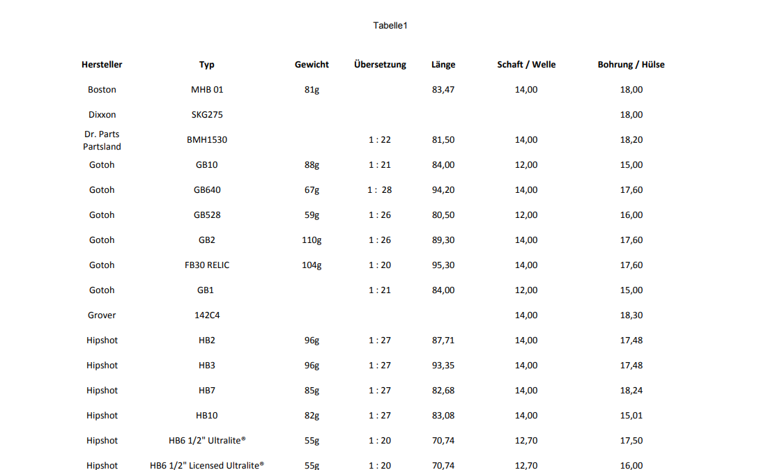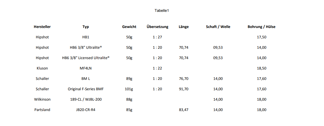 Ich hab mich, da ich einen Bass mit leichtem Body gebaut habe, und keine Lust auf Kopflastigkeit hatte, lange mit dem Thema leichte Mechaniken beschäftigt. Dabei ist diese Tabelle raus gekommen: