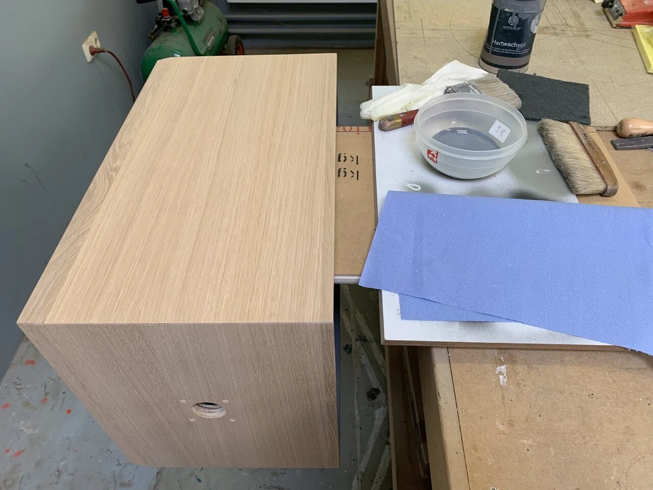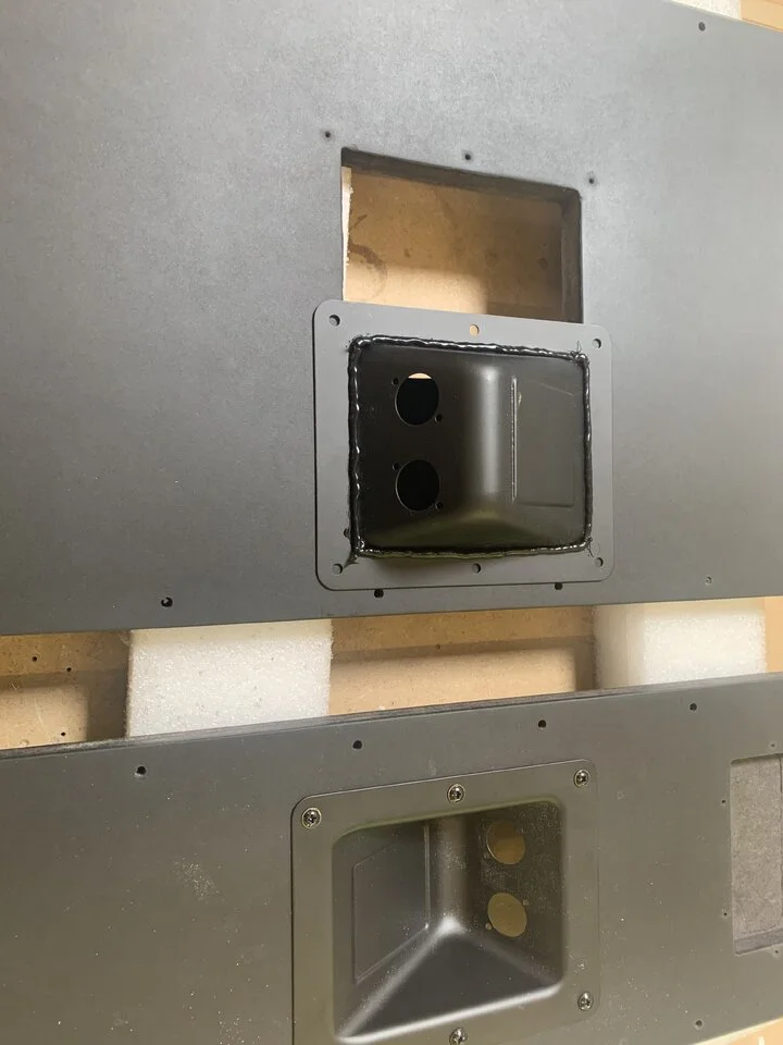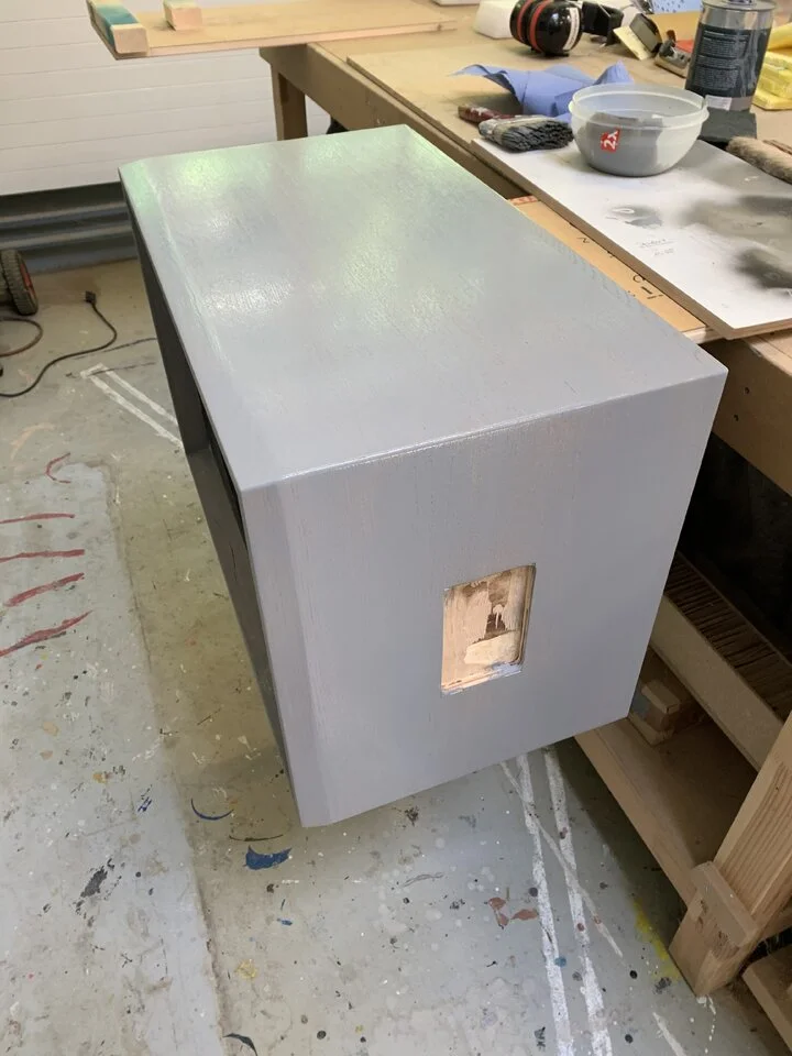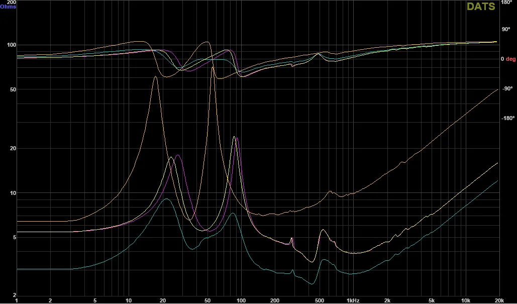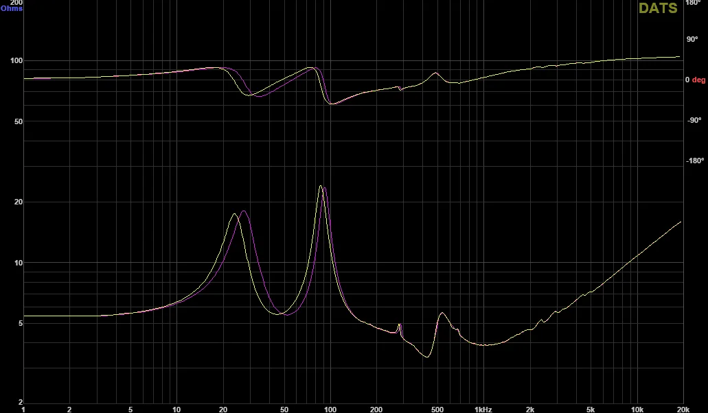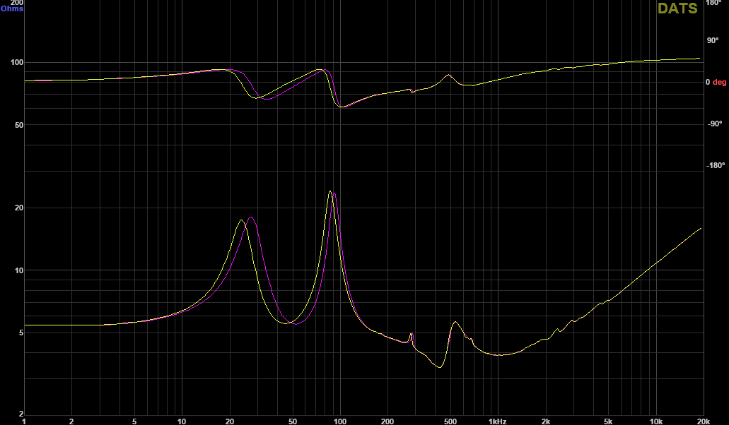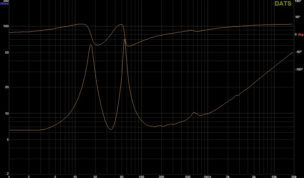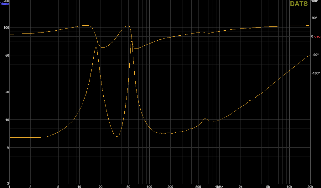 Angepeilt waren paar&60Hz "normal" und 55Hz "Step-down" durch Verkleinern der Tunnelfläche. Das war ein Kompromiss aus dem verfügbaren Bauraum in der Tiefe und Mindestquerschnitt für den Betrieb bei höheren Pegeln. Man sieht, dass der erste "Peak" niedriger ist als der zweite. Das bedeutet, die Resonanzfrequenz der Box liegt niedriger als die des Tieftöners. Das würde ich allerdings noch einmal genauer messen wollen, wenn die Box ein paar Stunden wirklich arbeiten musste. Mein Bauchgefühl sagt mir, dass der Lautsprecher bisher noch nicht viel erlebt hat und sich da noch was ändert, wenn der mal richtig eingespielt ist.