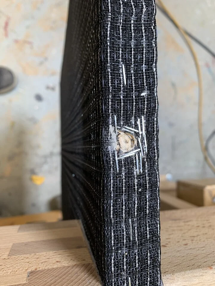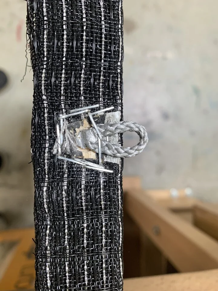So, es geht langsam auf die Zielgerade. Donnerstag habe ich die Stoffrahmen fertig gemacht; kleine Laschen aus Nylonschnur gemacht, mit silbernem Sprühlack farblich angepasst und an der Rahmenunterkante montiert. Anschließend das Piping rundum angetackert- Rahmen fertig, passen „saugend“, ohne weitere Fixierung.Silberstreif am Horizont. Es nähert sich der Fertigstellung.![]()