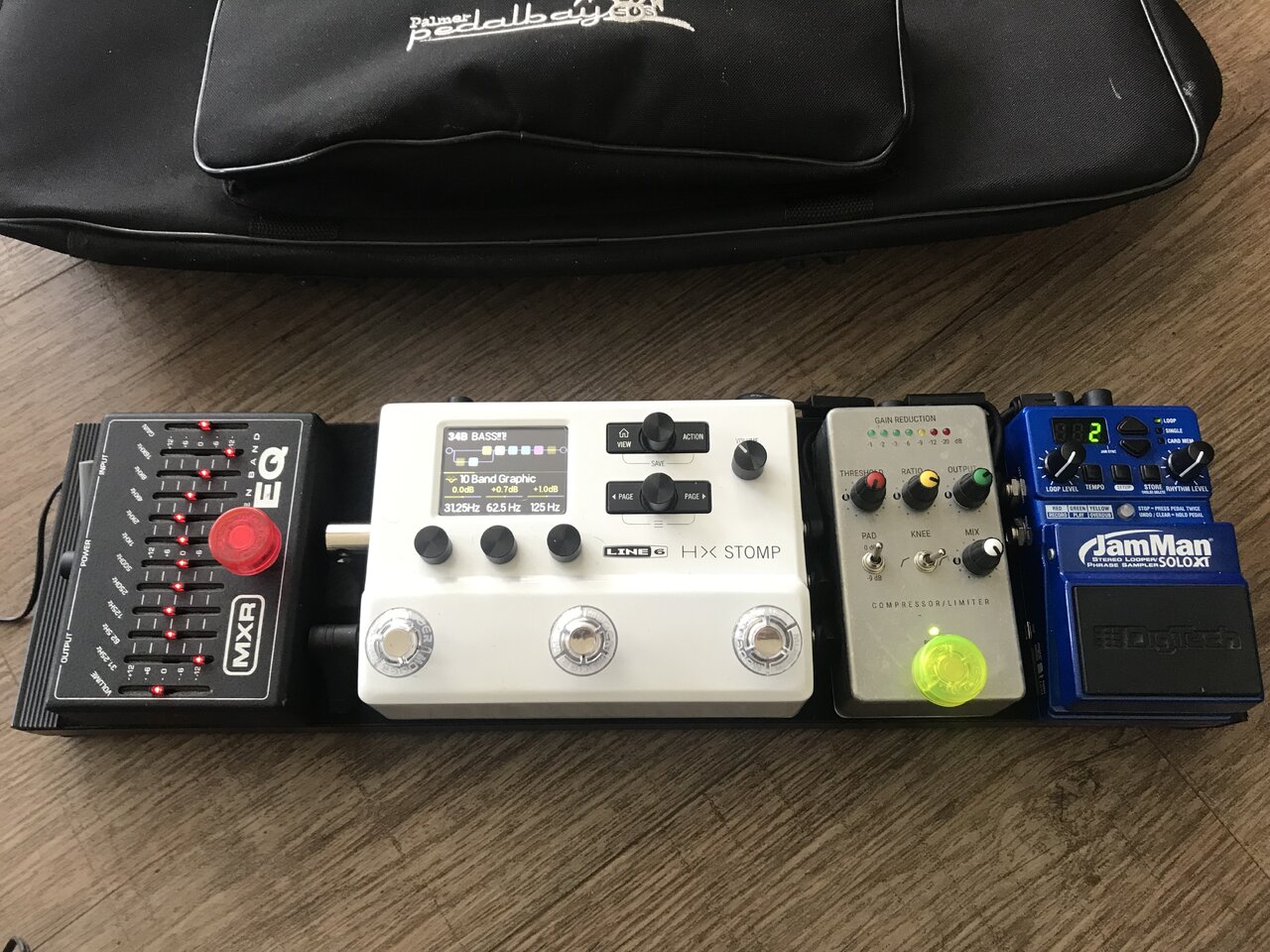 Für einen Projekteinsatz mit absehbarer Dauer möchte ich ein Line6 HX Stomp, einen MXR M108, einen Digitech JamMan Solo Xt und einen Schalltechnik_04 Pumpernickel auf einem Palmer MI Pedalbay 50S betreiben.