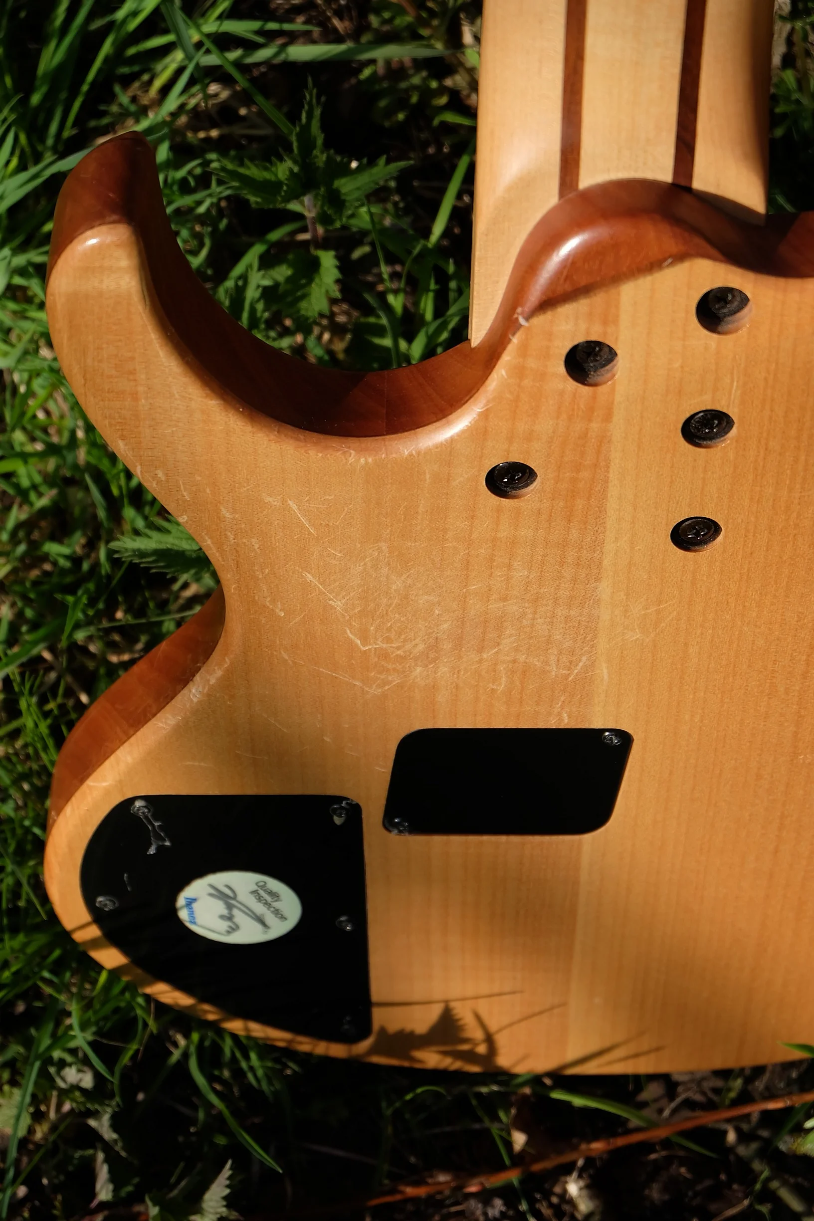 Verkaufe meinen mir sehr ans Herz gewachsenen Ibanez BTB 555, weil ich mittlerweile nur noch 4-Saiter spiele. Er war mir acht Jahre lang ein treuer Begleiter und hat im Proberaum, auf der Bühne und im Studio eine tadellose Leistung erbracht. Dadurch hat er hier und da ein paar Dings und Dongs kassiert, die aber das Gesamtbild nicht stören und meiner Meinung nach eher charakterfördernd sind