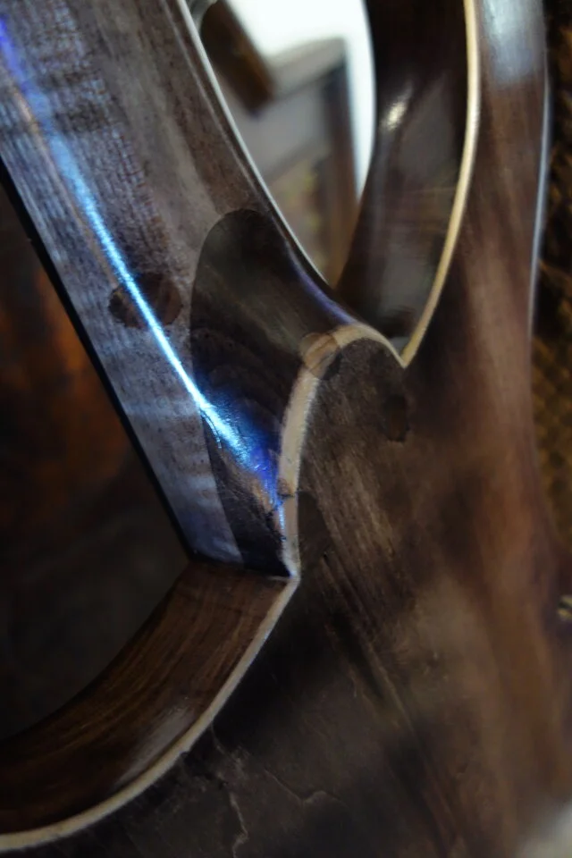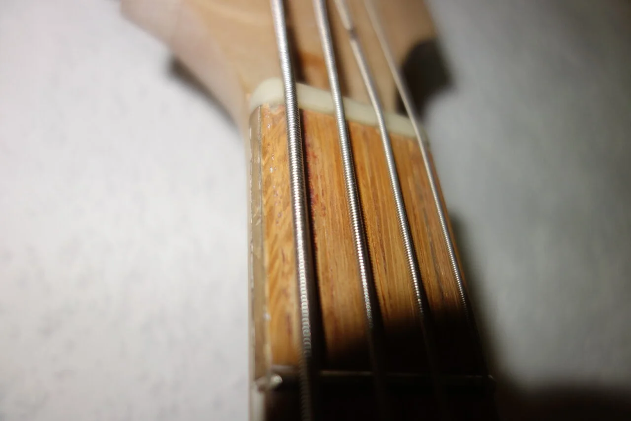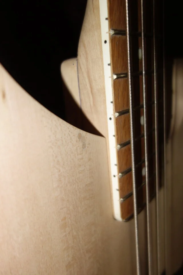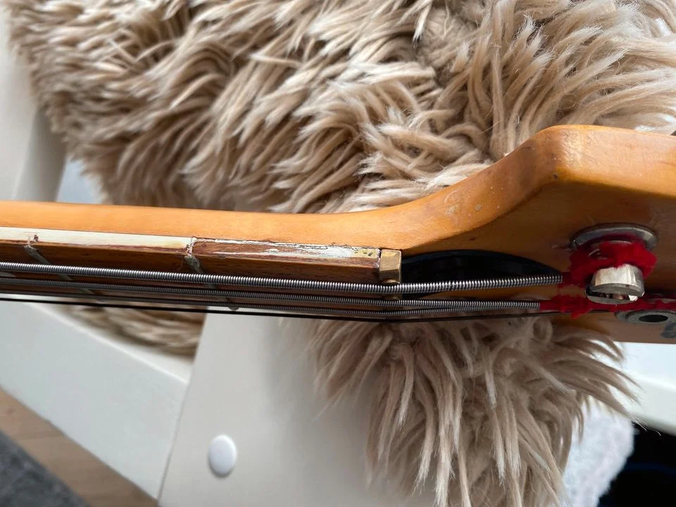 Das weiße Binding am ersten Bund hat es nicht überlebt. Dazu hatte der Hals noch einen leichten Backbow und ließ sich nicht mehr einstellen.