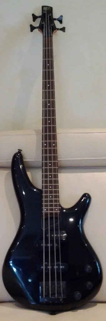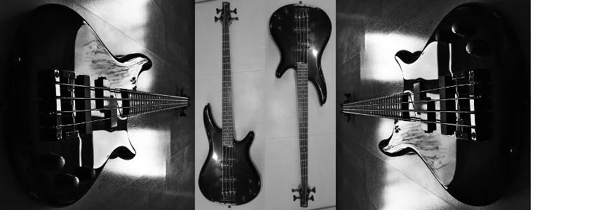 Für einen aktiven Stingray oder Warwick hat das Geld nicht gereicht und der Soundgear war von der Optik noch der Beste, das ich mir leisten konnte. Farbe: Schwarz, mit dunklem Griffbrett, P/J Bestückung, passiver Elektronik und sagenhaft leicht. Stolz wie Oskar habe ich das Teil jahrelang gespielt und war zunächst ganz angetan von der Vielseitigkeit, bis mir irgendwann mehr und mehr der schlanke Hals doch eher Verdruss bereitete. Mit den bevorzugten 45-105er Saiten ist die Einstellung schwierig, und das Schnarren auf den ersten drei Bünden war kaum in den Griff zu bekommen. Der zwischenzeitlich alternativ eingesetzte Aria Pro II war da schon unempfindlicher, ließ aber aufgrund des durchgehenden Halses deutlich die Attack vermissen.