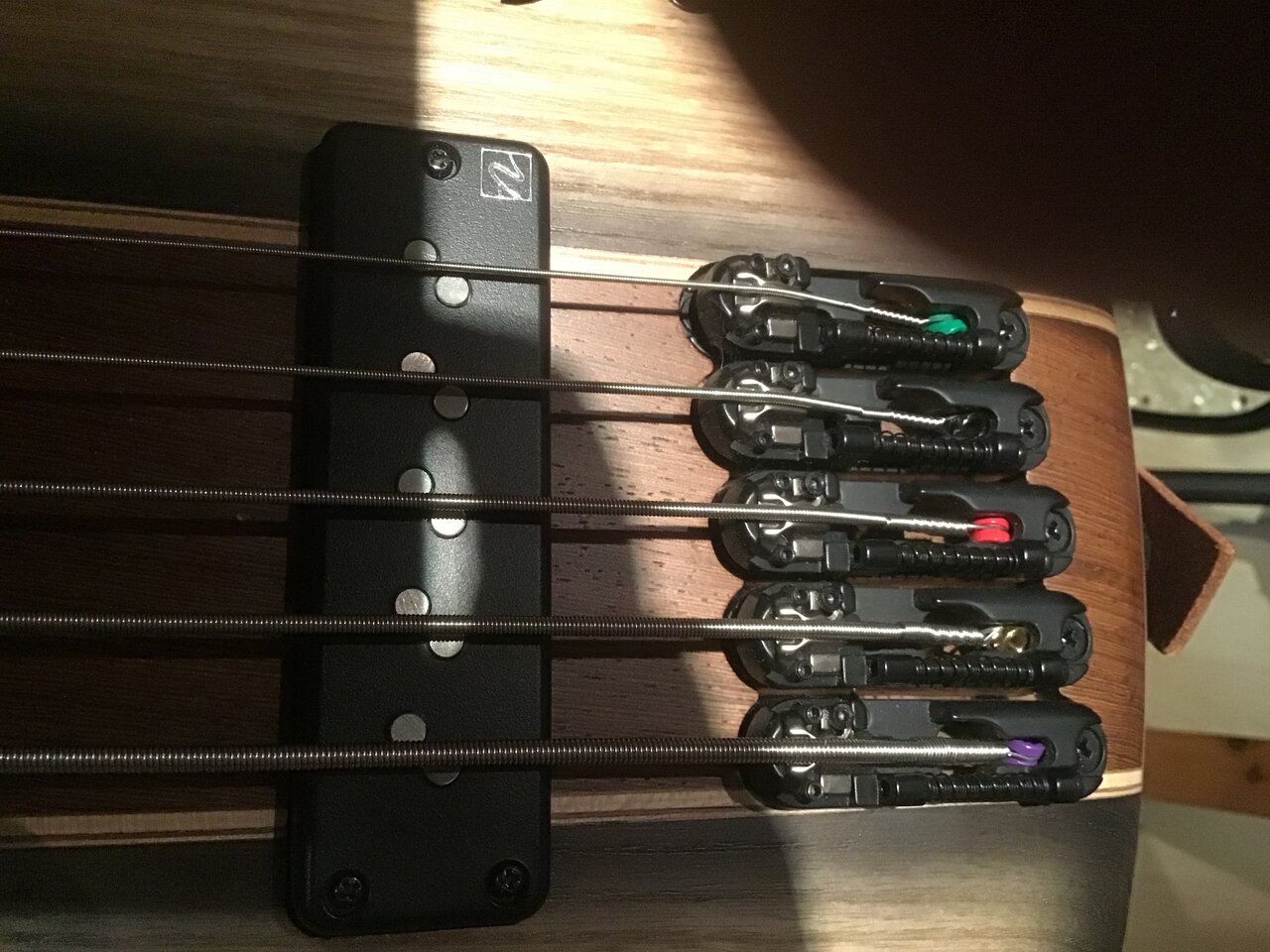 Daran änderte auch die Neubesaitung mit meinen Lieblingssaiten Thomastik JF365 nichts. Mit dem Unterschied, dass sich die Intonation der B-Saite nicht mehr einstellen lässt, weil die Intonationsschraube schon zuvor fast am Anschlag war. Die Thomastik B-Saite ist mit 0.136" etwas dicker als die D'Addario B-Saite mit 0.130".