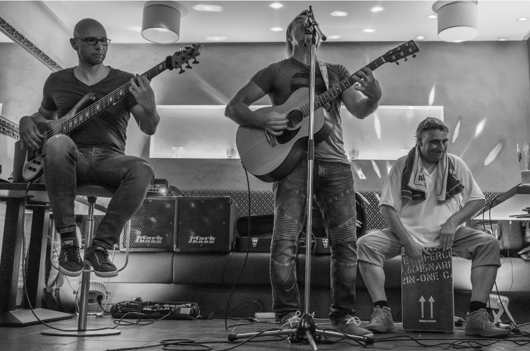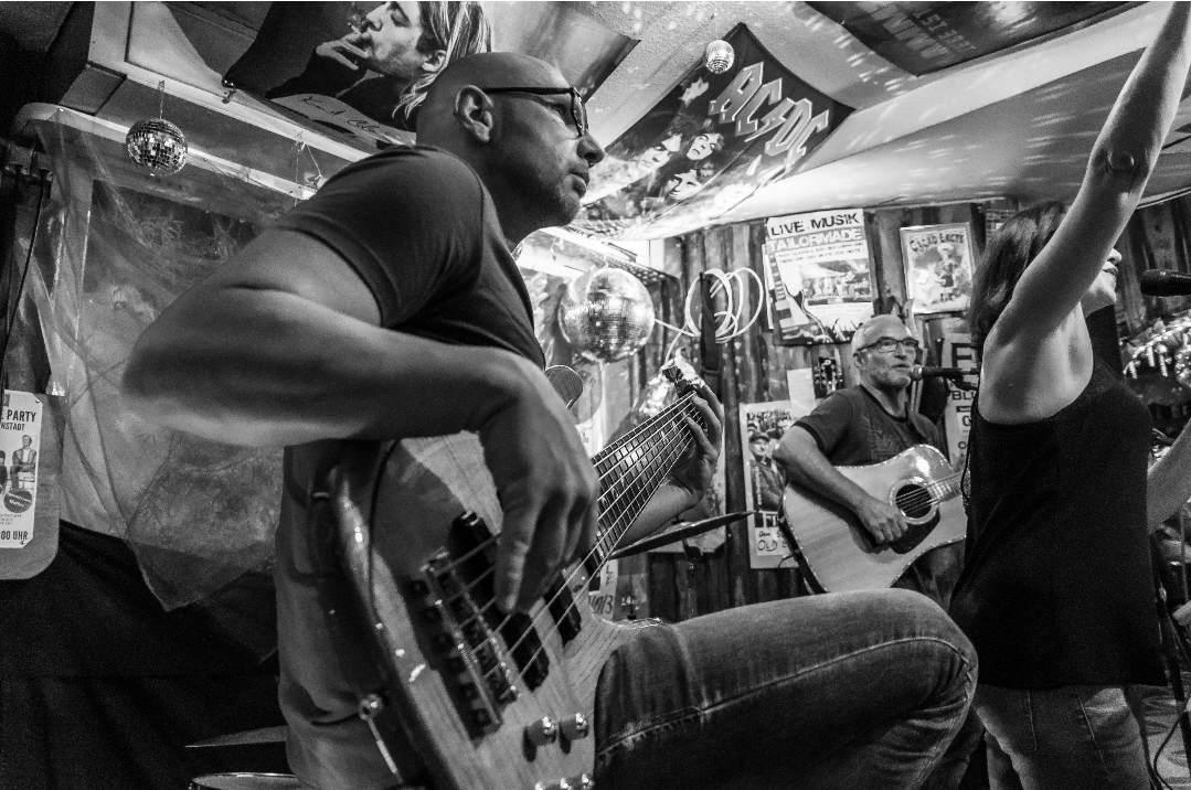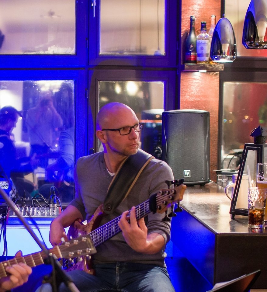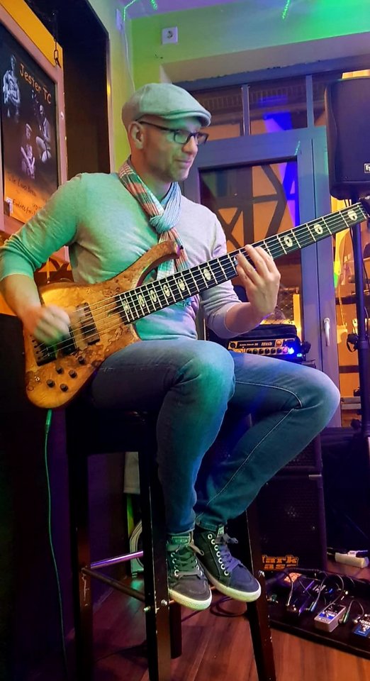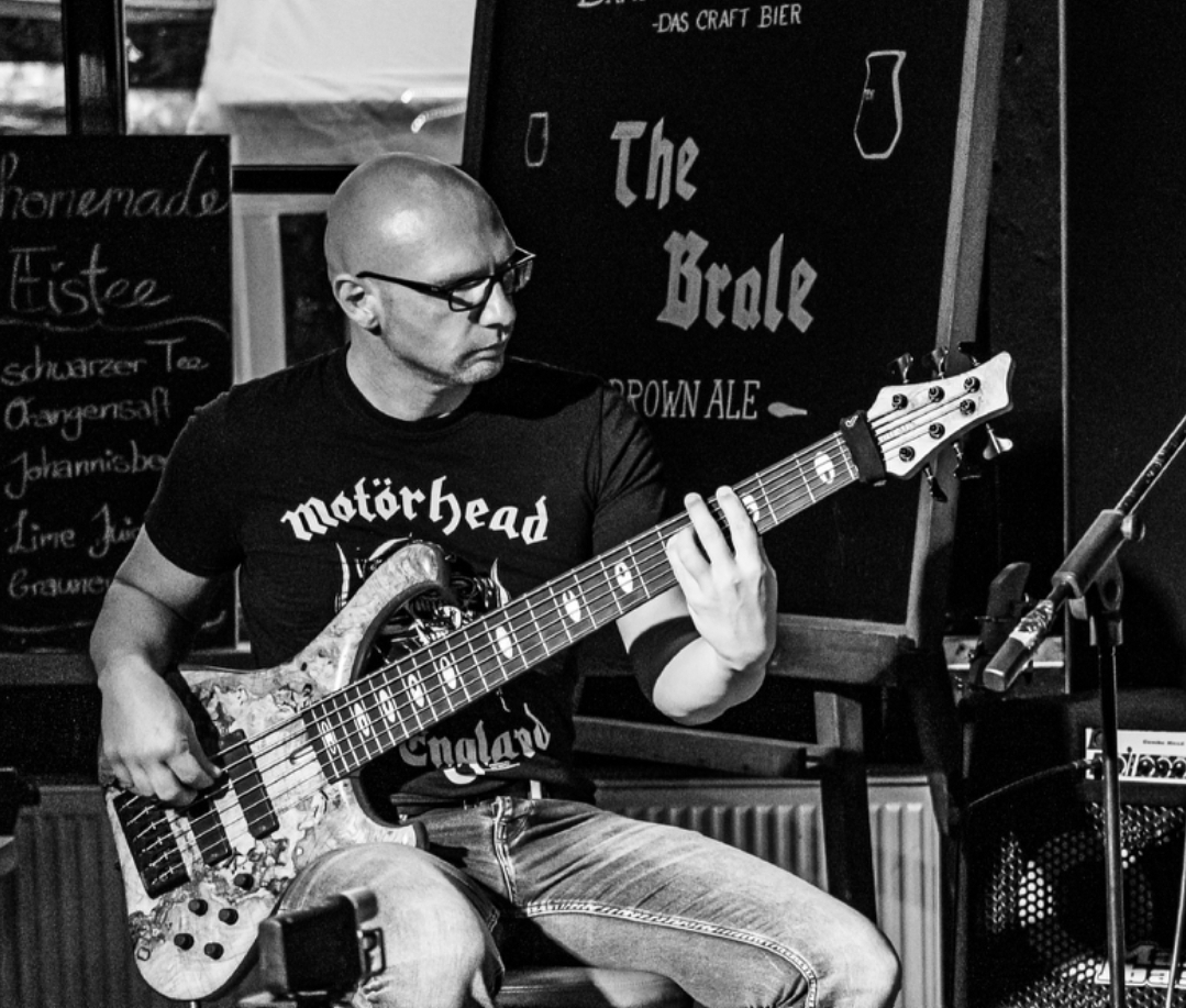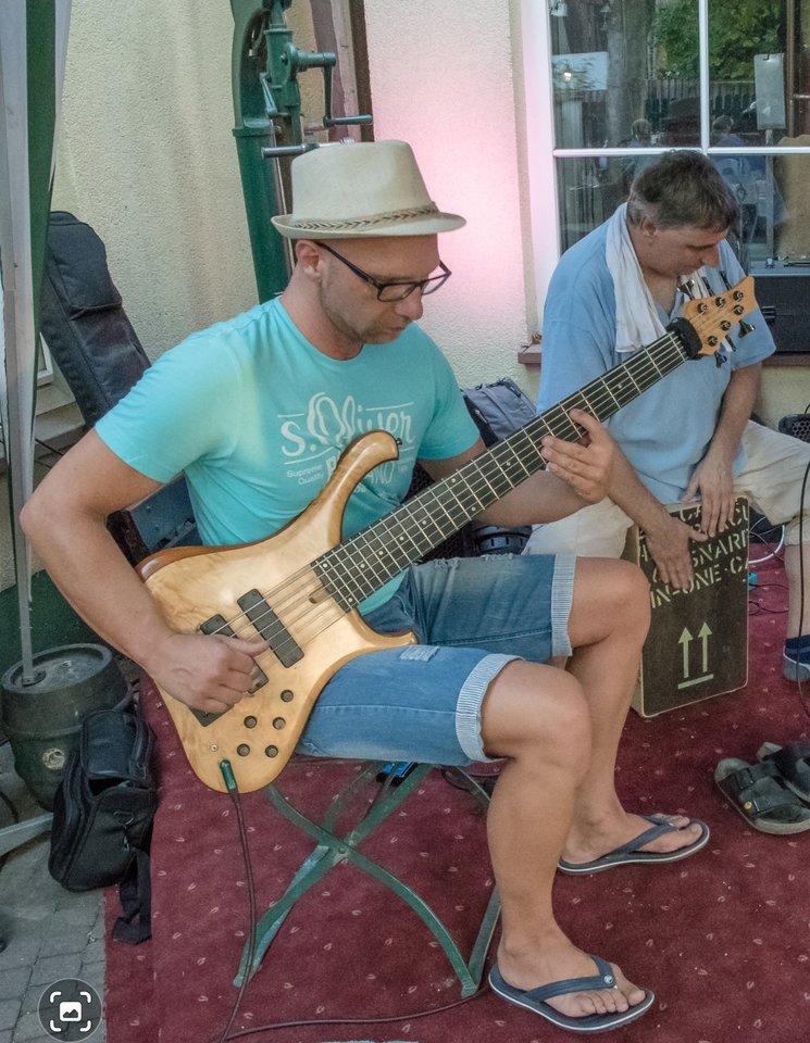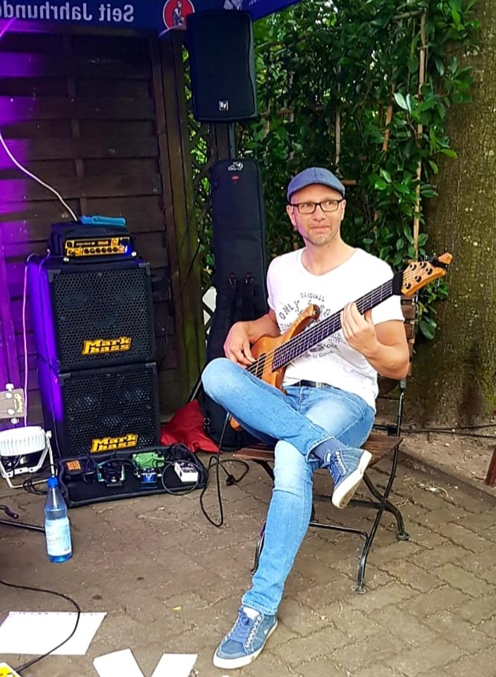 die Idee mit dem Gurt kürzer eingestellt, so dass der Bass gerade noch aufliegt: das scheint es zu sein für mich, einmal kurz richtig aufgerichtet und der Bass ist wieder da, wo er hinsoll, und das ohne Einsatz der Hände -sehr fein.