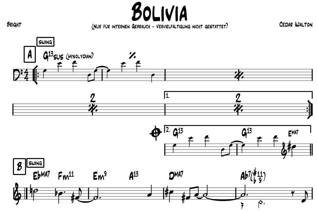 die Sheets die ich hier einstelle sind aus meinem persönlichen Fake Book (enthält z.Z. 3476 Stücke) die ich alle so geschrieben habe, dass für jedes Instrument das Essentielle eines Stückes in jedem Sheet vorhanden ist. Also z.B. Kicks, Breaks, zweite Stimmen, Intros/Outros, Bass Vamps etc.. Es ist also nie ein vollständiger Bass Part in einem Sheet vorhanden sondern es sind immer nur markante Stellen notiert.