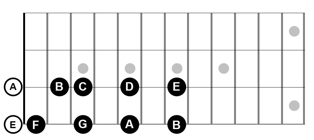 Alle 12 Töne der s.g. westlichen Musik liegen auf der E und A Saite innerhalb der ersten sieben Bünde, scherzhaft auch Money Notes genannt.