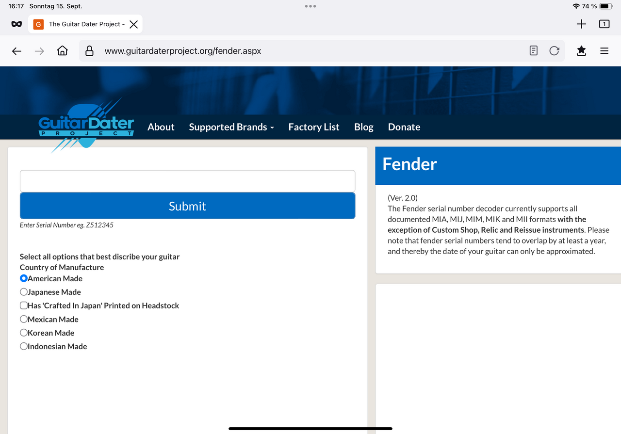 Dann mal aus Spaß die Seriennummer, die man gut auf dem Foto erkennt, bei Fender eingegeben: kein Resultat. Also, es gibt 2 Treffer, nichts davon ein Bass…
