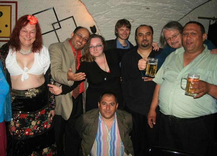 Der Mann neben mir ist der Kapellmeister. Kann natürlich auch sein, daß er mich auf die Bühne gebeten hatte - zum Tanzen - wegen meiner passenden Kleidung. Womöglich hatte er nicht damit gerechnet, daß ich auch mitspiele.