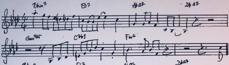 Oder Du gehst das Stück eher so an wie in dem ersten Beispiel von LaFaro, in dem der Bass eine deutlich traditionellere Funktion erfüllt. Was Du da für eine Bassline entwickelst, ist natürlich auch offen und zB davon abhängig, in welchem Tempo Ihr spielt. In dem hohen Tempo des Videos kannst Du schon fast damit anfangen, nur den ersten Ton jedes Taktes zu spielen. Oder auf 1 und 1+…