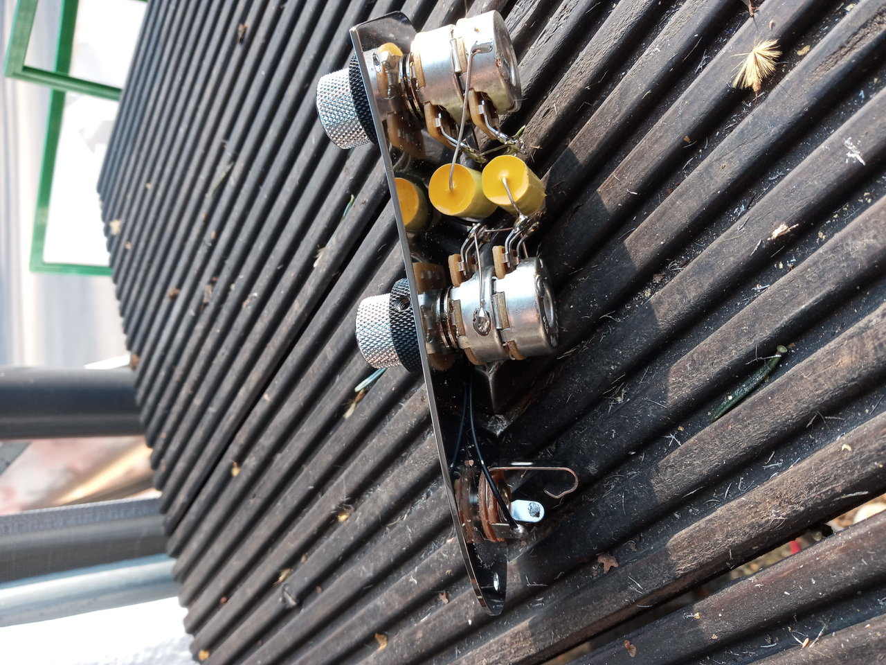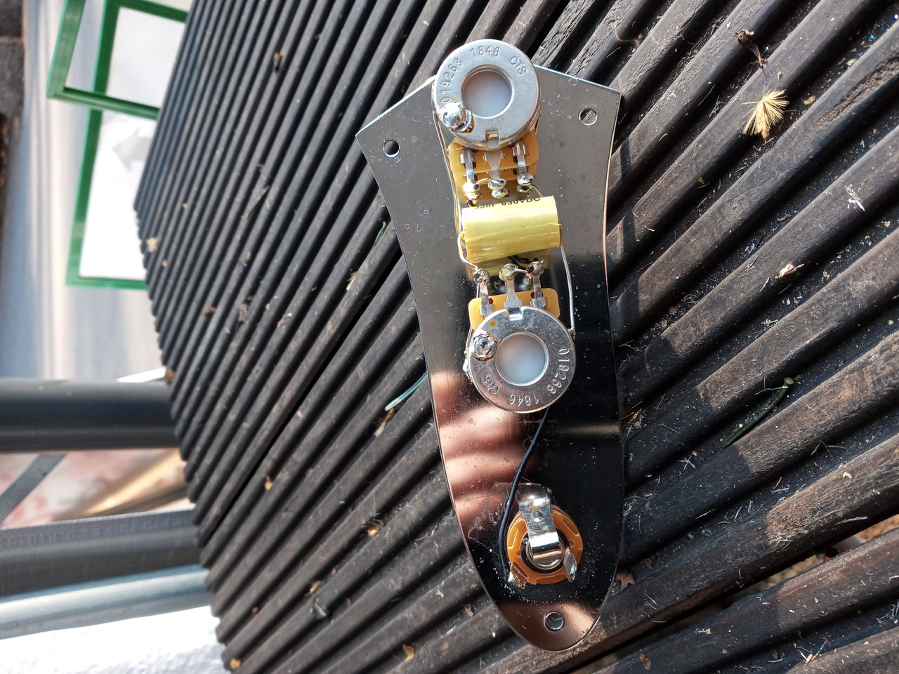 zum Verkauf steht diesmal eine JB Control Plate mit Stacked Knobs. Potis sind von CTS, jeweils mit 500/250k und Mustard Cap mit 33nf. Passt super zu DiMarzio Pickups. Der Ring regelt das Volume (500k), das obere Poti den Ton (250k).