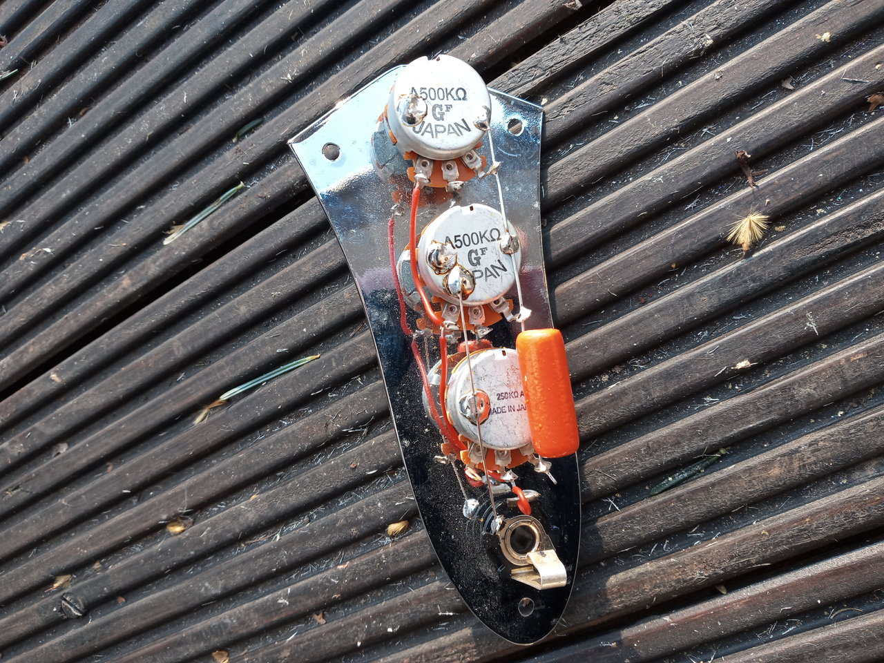 zum Verkauf steht diesmal eine JB Control Plate in bewährter VVT Konfiguration. 2x 500k Volume, 1x 250k Tone, Rockinger Potis, 47nf Orange Drop.