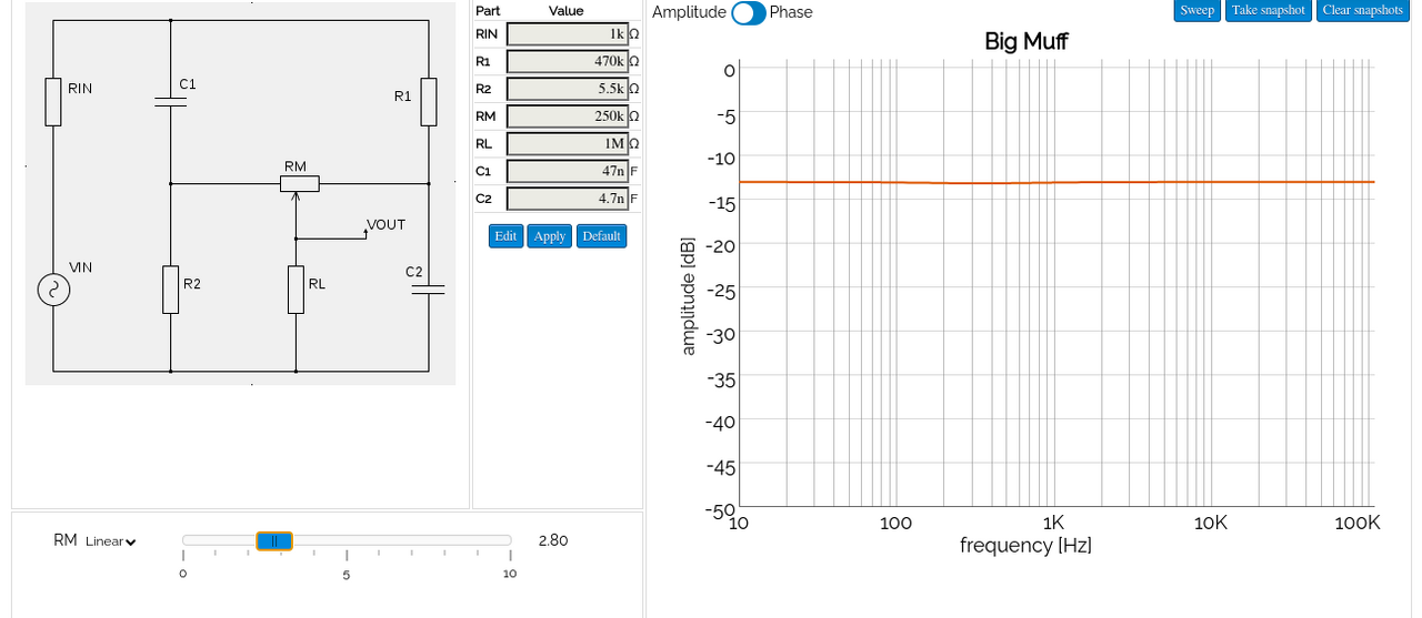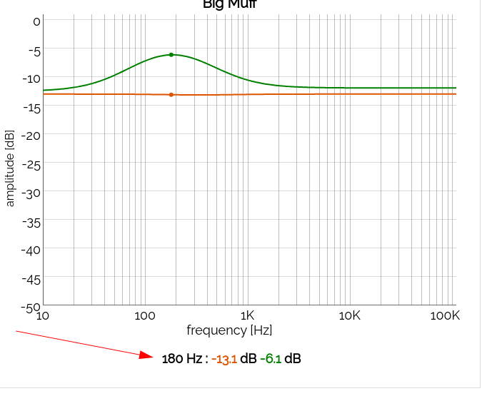 Wie man sieht verändert sich die Frequenz bei der abgesenkt und angehoben wird. Macht auch Sinn: das Big Muff Tone Stack besteht aus einem
