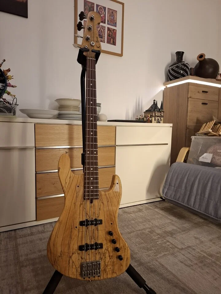 Ich habe heute mal wieder einen „Ich-will-es-wissen-Tag“ gehabt und alle meine Bässe durchgetestet. Da sind auch Jazzbässe dabei, welche von Sadowsky und auch einer von Knut. Erstere Hälse sind deutlich flacher als der Knut, gut spielen lassen sich aber beide. Müsste ich mich entscheiden wäre ich rein von der Haptik her lieber bei den Bässen von Roger. Allerdings ist der Klang von Knuts Bass deutlich voller, runder und erdiger. Und das kommt sicherlich vom Hals!