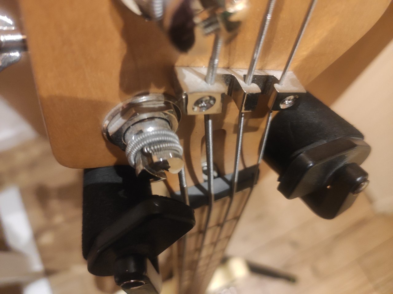 Der Gravity würde zum Beispiel mit der „linken“ Nase hinter der Tuner-Seite der Kopfplatte kollidieren, denn ich den Bass so knapp unter dieser Taille einfädele, dass die Halter noch oberhalb des Fretwrap bleiben.