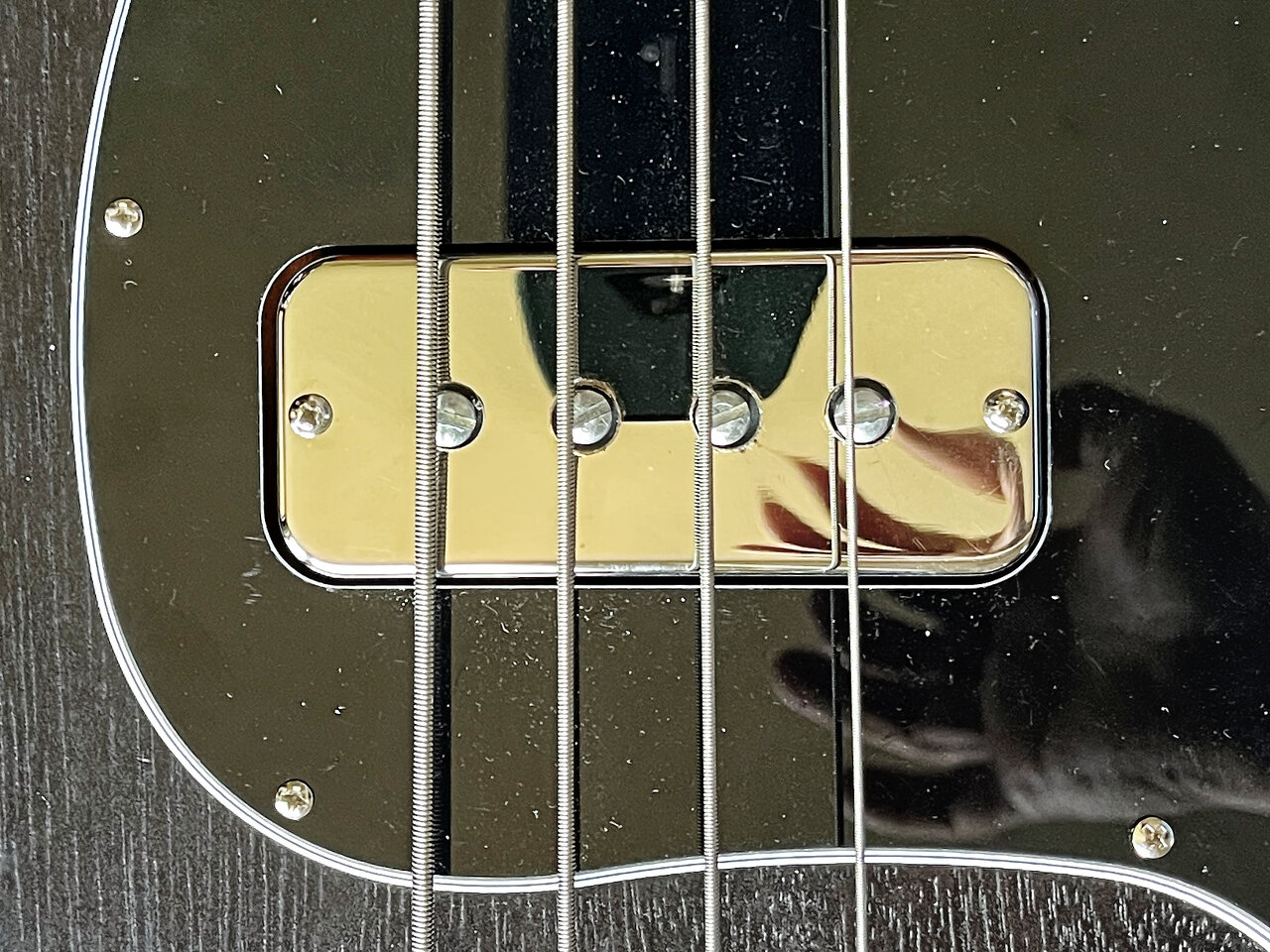 Hier das Pickup, mal abgesehen dass die Saiten etwas neben den Polepieces liegen, hat der Verkäufer mir nach den Erhalt auch erklärt er hätte Schrauben mit einem breiterem Kopf für die Pole Pieces benutz, und vor Versand wieder zurückgebaut. Eventuell sehen deshalb die Ränder um die PolePieces so angefressen aus.
