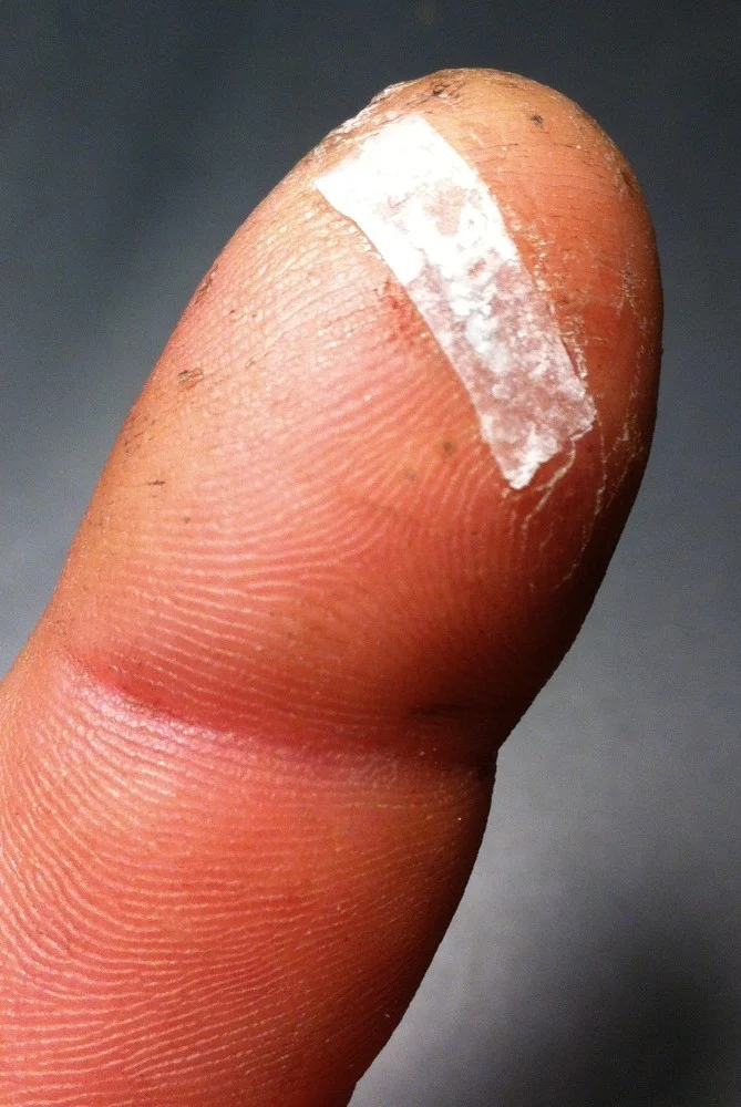 Ich habe mir gerade einen provisorischen Klebe-Verband gemacht; aus Küchen-Krepp und Sekundenkleber.