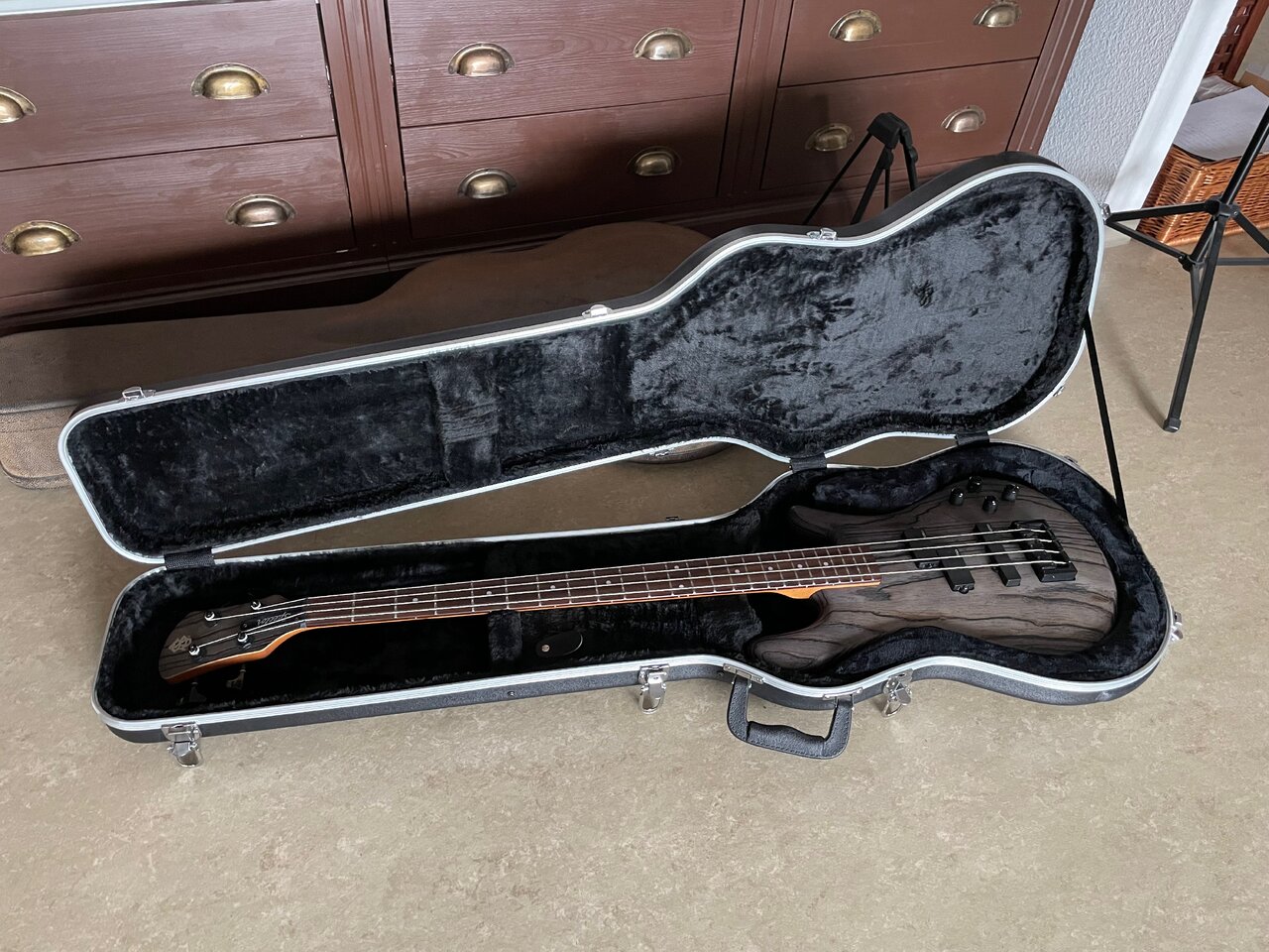 Also: Kauft euch eine Polyethylen-Schaumplatte (PE-Schaum), da gibt's bei boxmarket.eu eine Platte, 5cm dick im Format 60x40 (das dürfte reichen) für €3,30; mit Versand aus Polen seid ihr bei ca. €15. Dann malt ihr euch eine Schablone auf Papier: außen der Umriss des Innenraums des Koffers, innen die Form des Basskorpus. Ausschneiden, auf die PE-Platte legen, mit einem Filzer die Kontur zeichnen, mit einem Messer die Form ausschneiden. Ich habe dann noch 5mm dicken schwarzen Plüsch bestellt, den mit doppelseitigem Klebeband auf der Form befestigt (ist eine kleine Frickelei ...) und das dann (wieder mit dem doppelseitigen Klebeband) direkt auf den Plüsch im Koffer geklebt. Ich übernehme keine Garantie, wenn's nicht klappt!! Bei mir hat's aber geklappt. Bei dem Warwick Rockcase Formkoffer (für €109 beim T) war das insgesamt eine preiswerte Lösung. Erfordert aber etwas Geduld und Spucke!Anhang anzeigen 773194Anhang anzeigen 773195Anhang anzeigen 773196Anhang anzeigen 773197