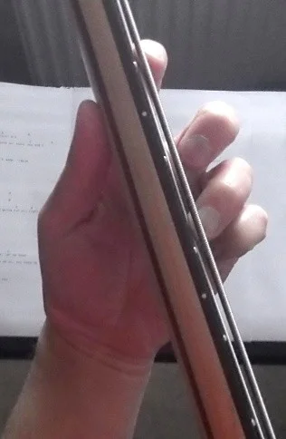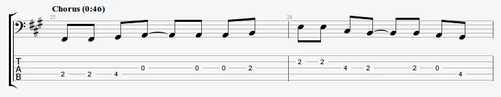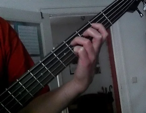 Nun habe ich mir vor einigen Tagen einen neuen Song zum Üben vorgenommen. Dort gibt es Abschnitte (z.B. s. Bild) die bei mir sehr schnell zur Ermüdung der Greifhand führen, bis hin zu Schmerzen im Daumen, der Hand und manchmal auch im Unterarm, je nachdem wie oft/lange ich diese Takte spiele. Daher habe ich mal genauer auf die Haltung meiner Greifhand geachtet und ich glaube, das liegt an meiner komischen (fast schon verkrüppelt aussehenden) Haltung. Komischerweise halte ich die Hand (besonders mit dem "eingeknickten" Zeigefinger) überall am Hals so, erst recht fällt das natürlich in den ersten Bünden (tiefen Lagen) auf. Habe mal versucht Fotos zu machen, alleine gar nicht so einfach!