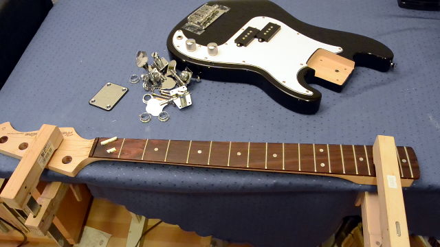 Beim 6-Saiter werde ich zunächst eine minimale Konversion vornehmen: Montage von Brücke und Sattel einer Strat-Brücke und Umrüsten der Kopfplatte auf vermutlich 3+3 asymmetrisch. Nach Möglichkeit möchte ich Bassmechaniken verwenden; notfalls kommen auf die Diskantseite Gitarrenmechaniken.