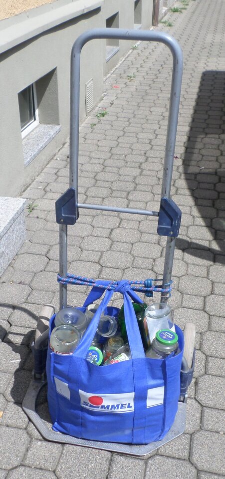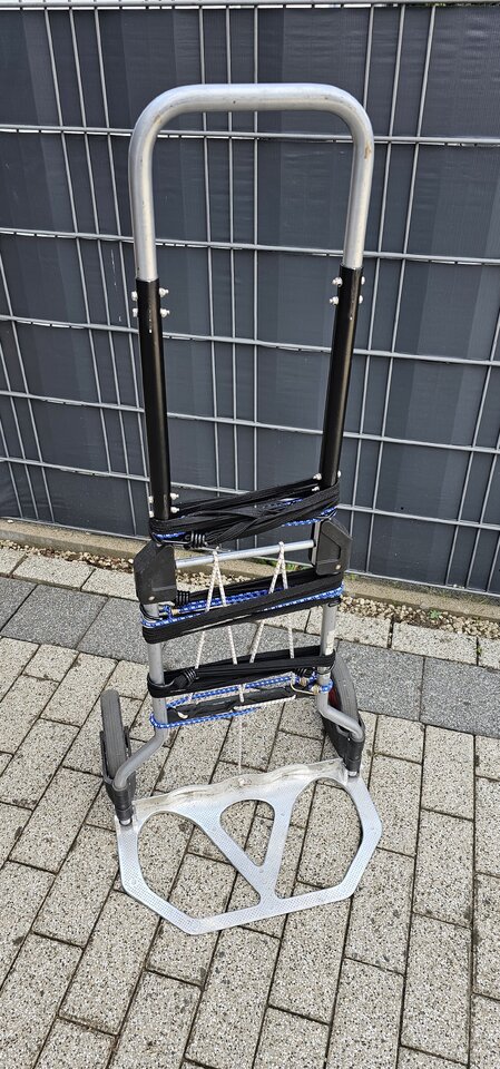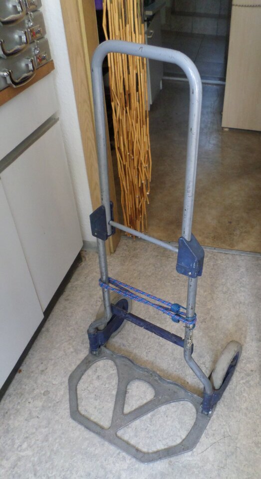 Jetzt hatte ich die Schnauze voll und hab den Griff einfach verlängert, da es anscheinend nur so niedrige Klappsackkarren gibt....