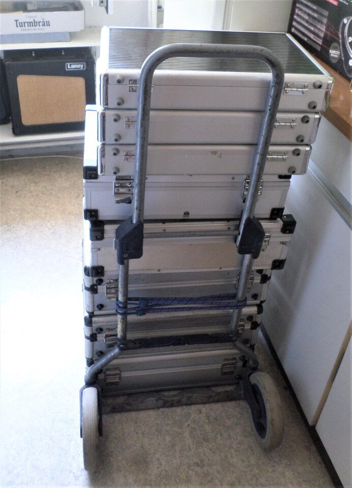 Jeder von denen wiegt so ca 10 bis 20 kg, je nach dem, was alles drin ist - aber immer alles aus Eisen, Stahl, Messing, Bronze, Holz und Kunststoff, immer dicht gepackt und rappelvoll. Die kleinen oben drauf sind etwas leichter. Treppauf schaffe ich das gar nicht mehr. Da lade ich nur die Hälfte drauf. Und der kleine Verstärker hinten in dem Regal und anderer sperriger Elektrokrempel wie Lautsprecher, Mikrofonständer usw ist da noch nicht mal mit drauf.